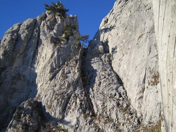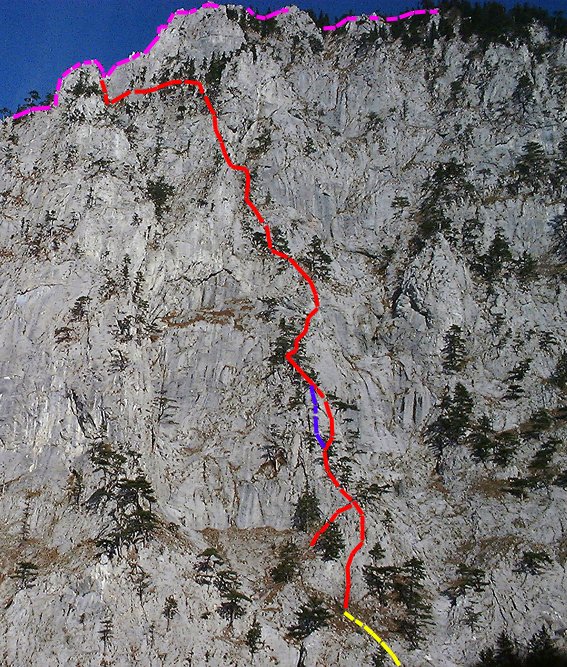 Vom Ausstieg folgt man noch 6 Seillängen dem Stadelwandgrat 3 bis zur 'Märchenwiese' mit einer Huette, von der man auf (gelb) markiertem Steig rechts unter die Wand zurueckkehren kann.