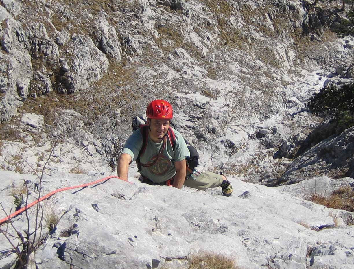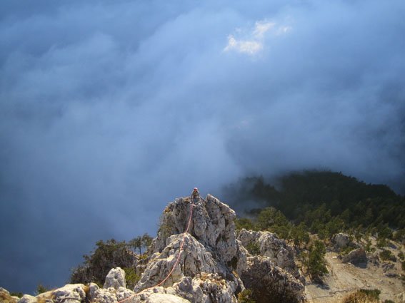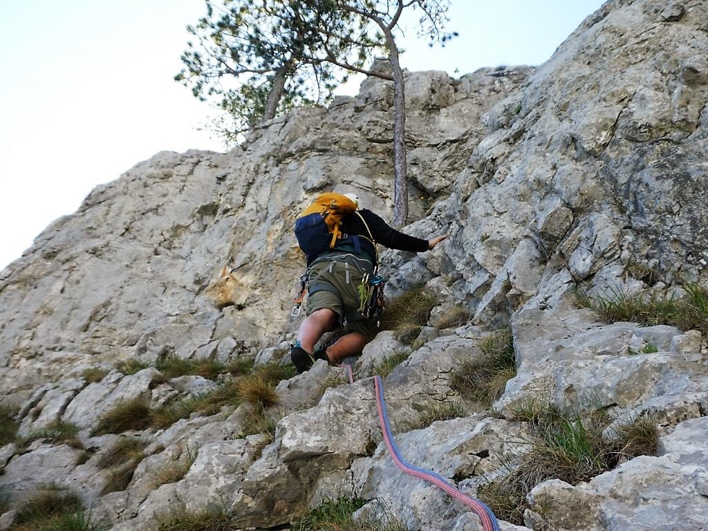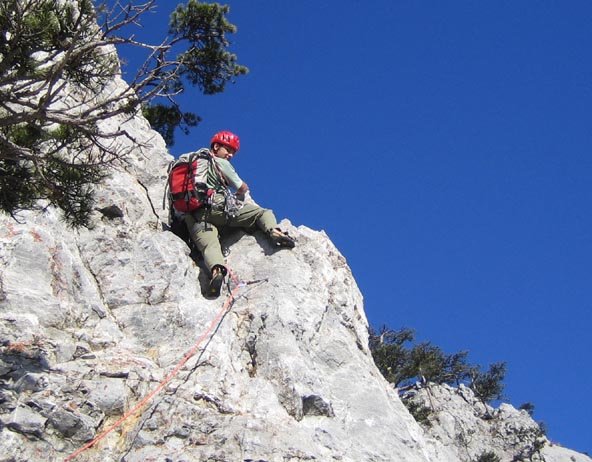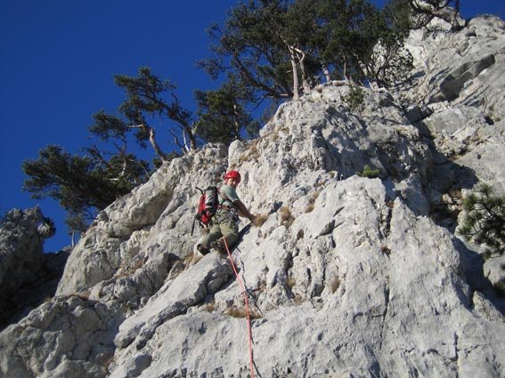 Einfachseil 50 m, 8Expr. Schlingen, 2 lange Bandschlingen, Klemmkeile und HELM! nicht vergessen! Die Standplaetze sind mit Klebehaken eingebohrt oder an Bäumen.