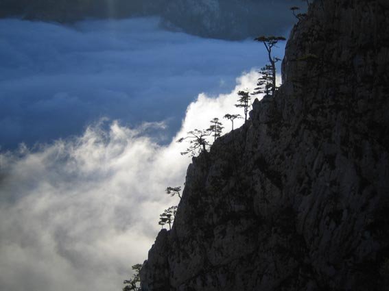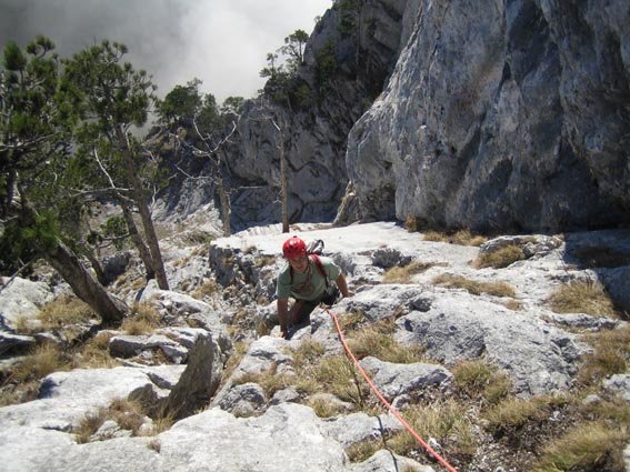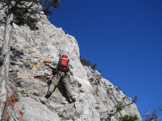 Stände meist gebohrt oder an Bäumen. Dazwischen stecken an den schwierigen Stellen Bühler- und einige Normalhaken.
