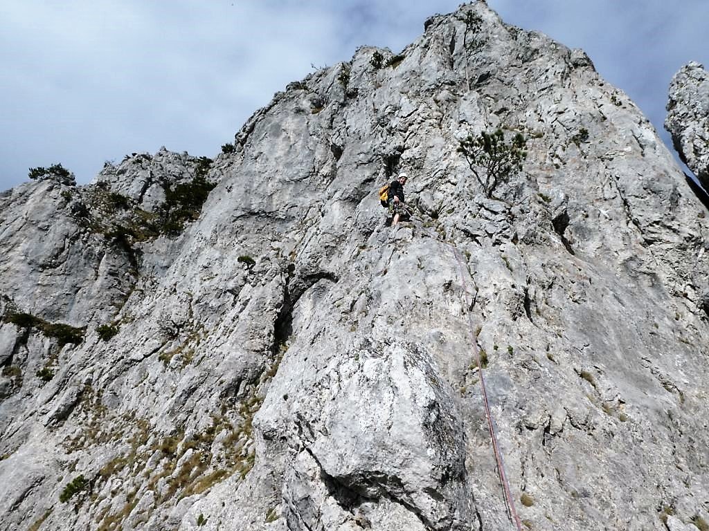 Brunnerweg ist nicht sehr homogen und enthält neben sehr schönen Kletterlängen auch solche mit Gras und etwas brüchigem Gestein und ist eine alpine Tour. Wer aber dazwischen auf rauhem Fels klettert, als einzige Seilschaft in der Tour unterwegs ist, während sich im benachbarten Richterweg oft Karawanen unter der abgeschmierte Richterplatte anstellen, lernt diese Alternative schätzen.