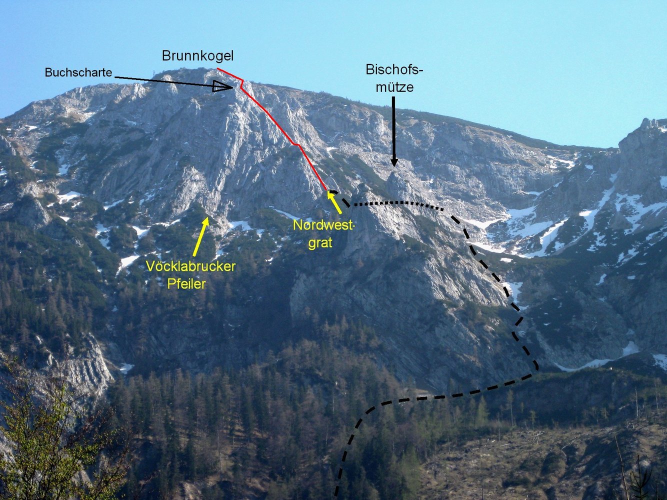 Siehe auch Topo. Logische Route über die Rippen des „Nordwestgrates“, der von der Bischofsmütze (1446 m, vorgelagerter Doppelturm mit kleinem Gipfelkreuz) zum Brunnkogelgipfel hinaufzieht. Ausstieg auf dem unmarkierten „Franz-Scheckenberger-Steig“ kurz vor dem Gipfel.