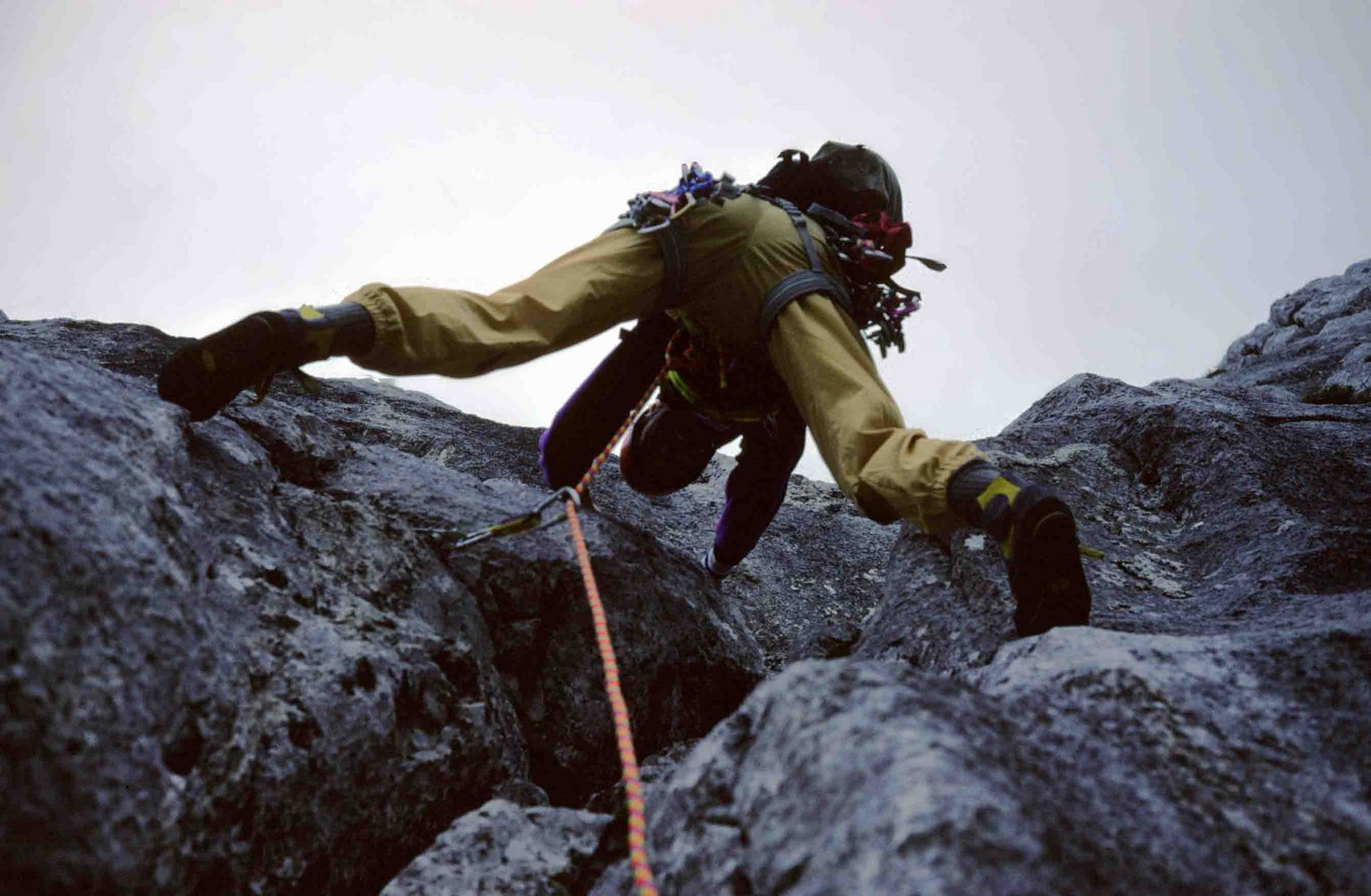 Alle Stände sind gebohrt, dazwischen an schwierigen Stellen ebenfalls Bohrhaken. Keile und Friends können auch zusätzlich angewendet werden, sind aber nicht erforderlich.