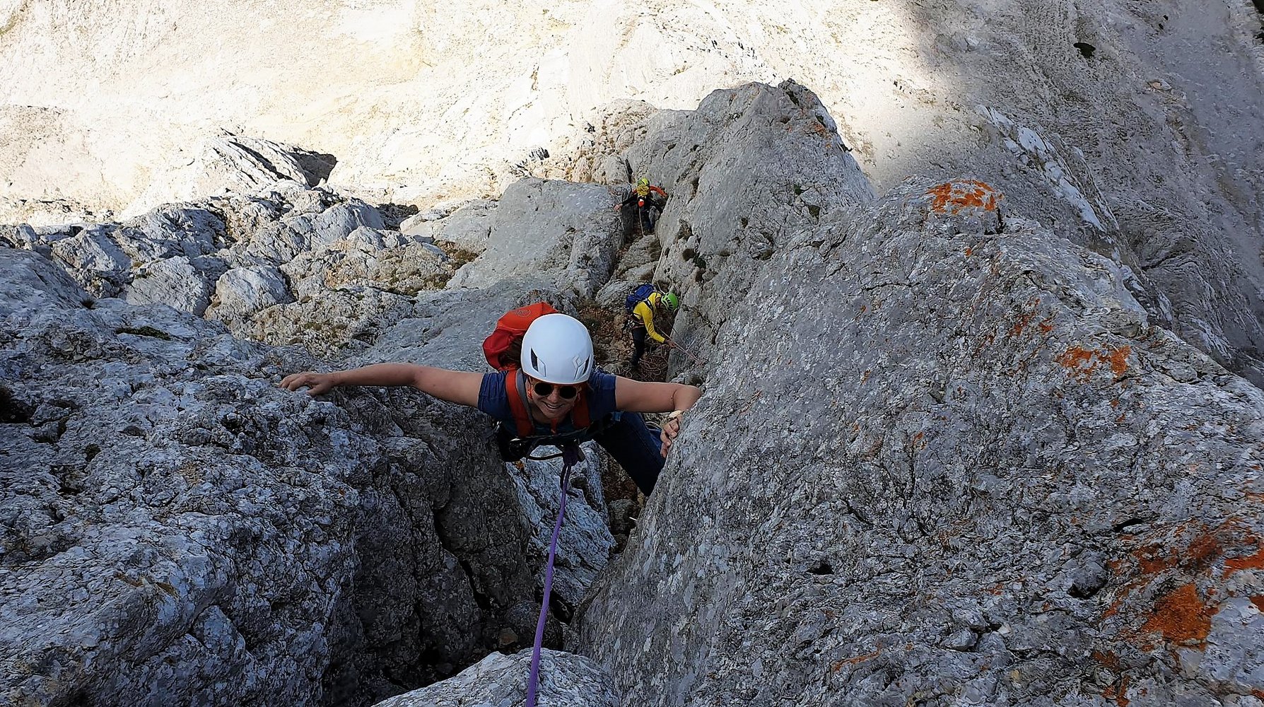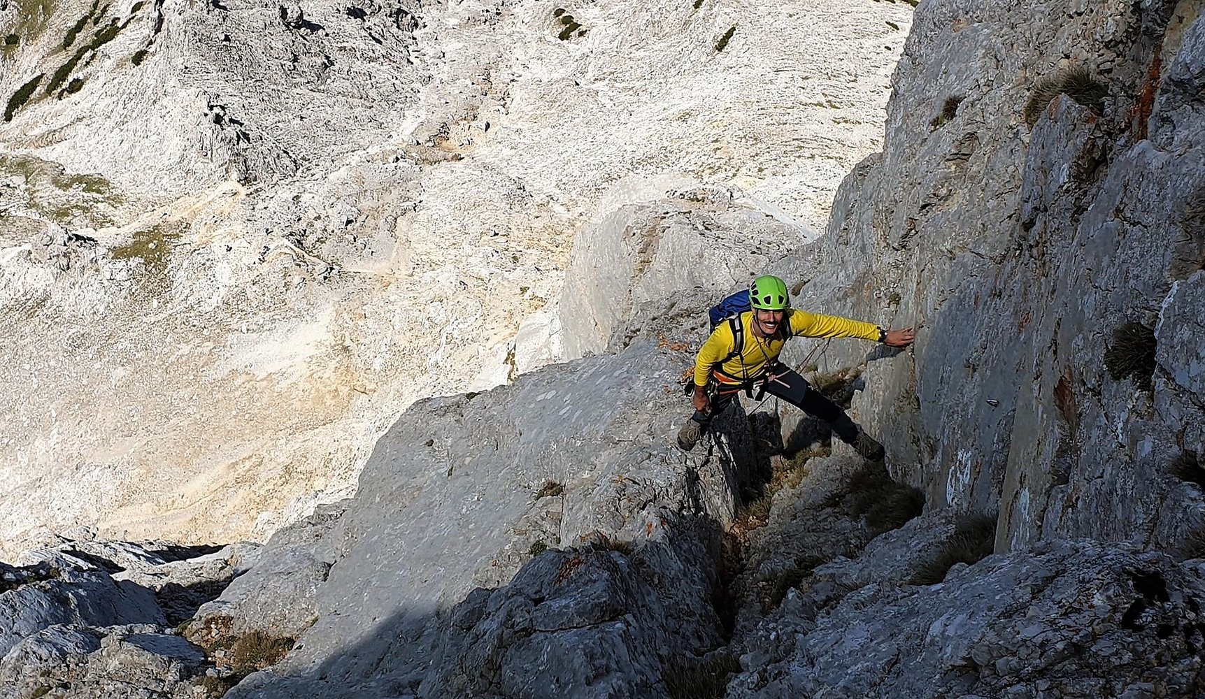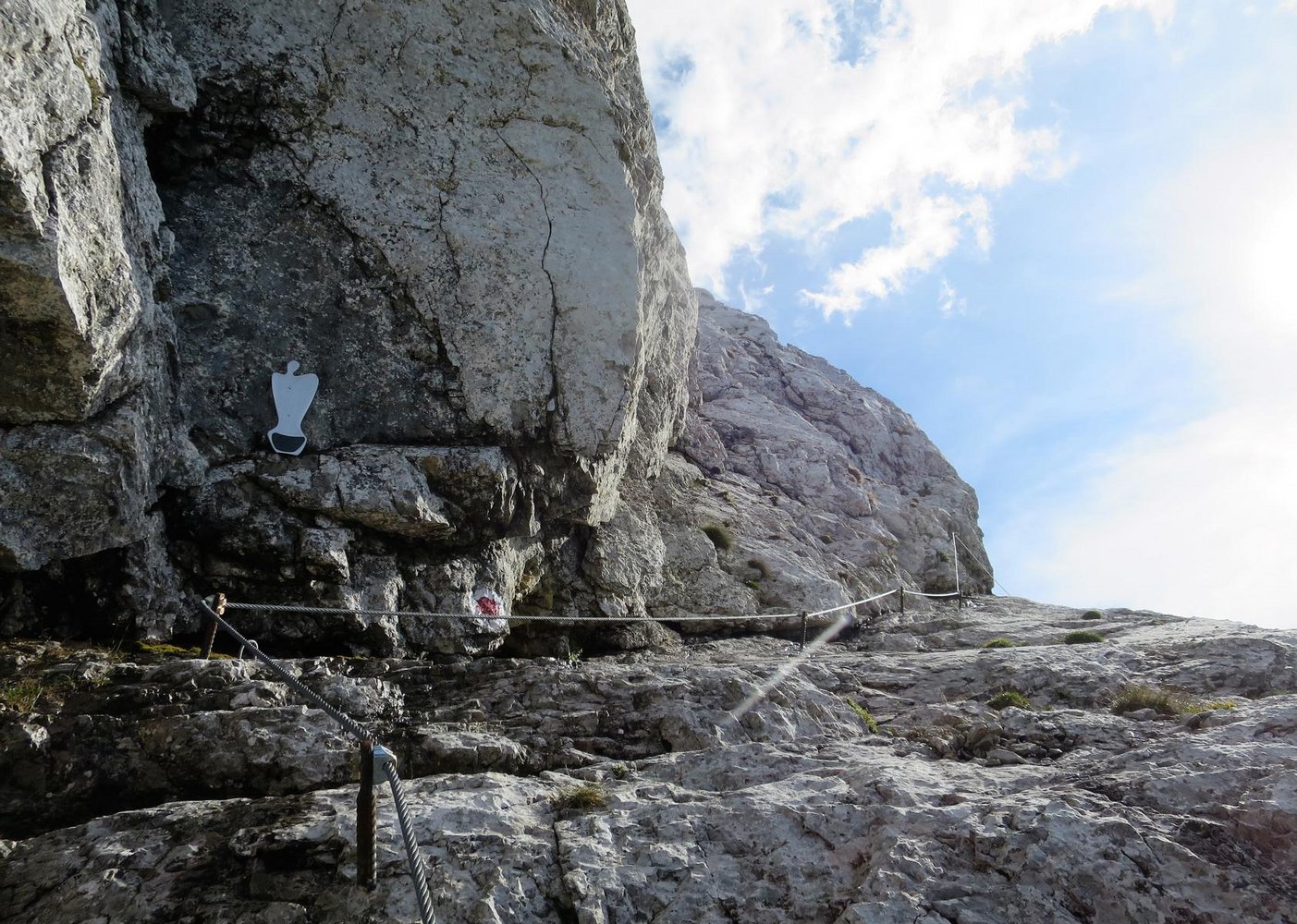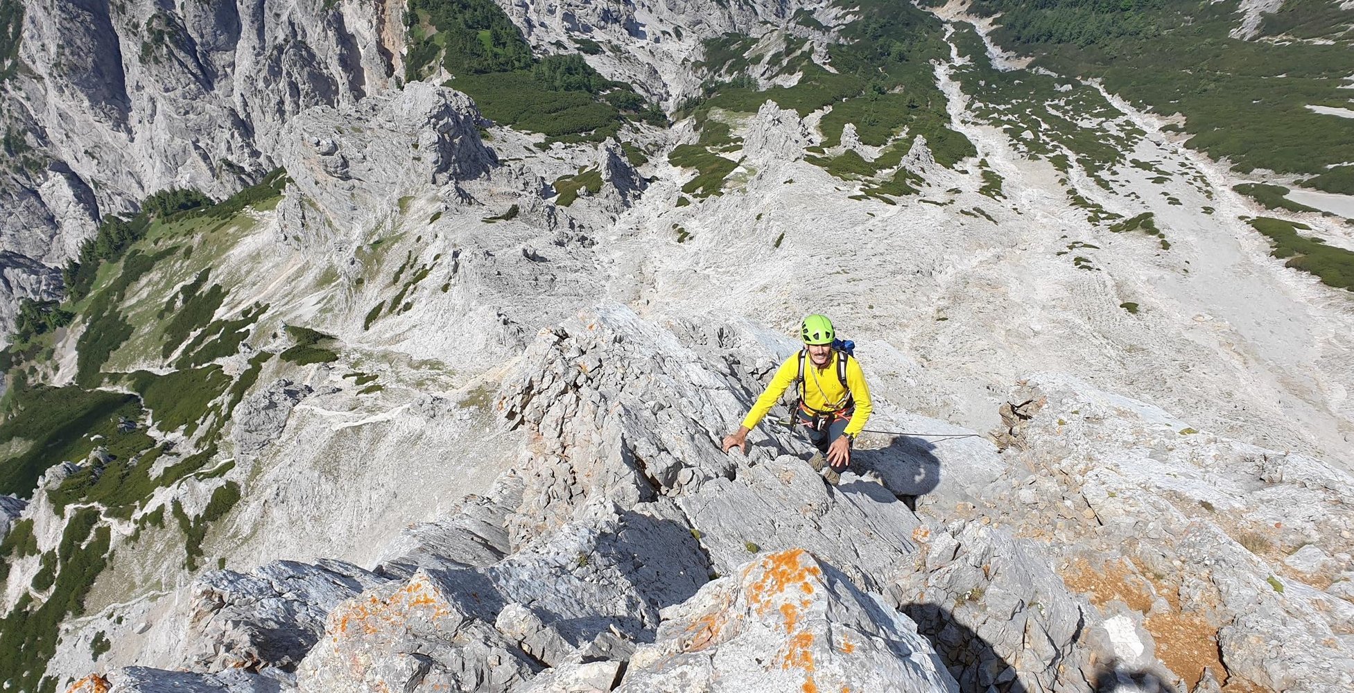 50 m Einfachseil, 6 Expressschlingen, ein Klemmkeilgrundsortiment, einige Bandschlingen und Helm. Für den Abstieg über den Klettersteig, Klettersteig-Set.