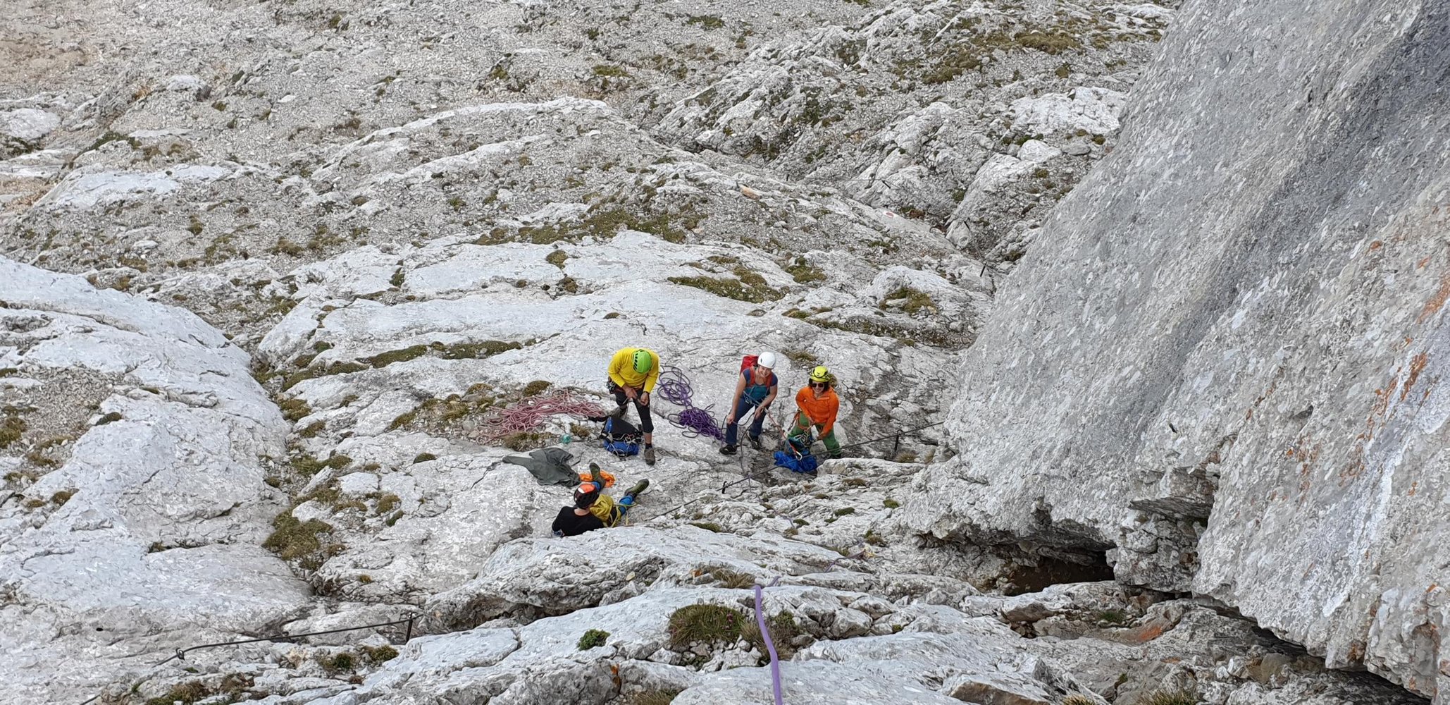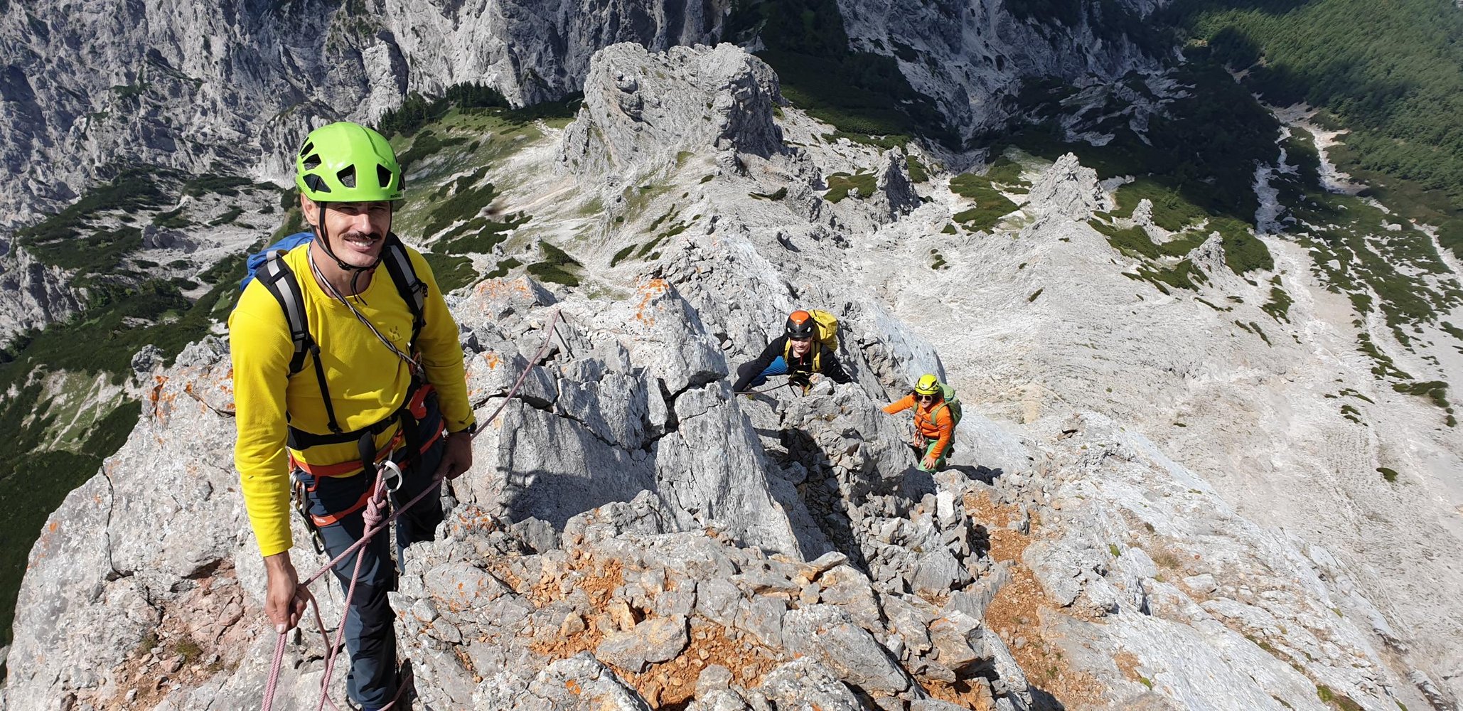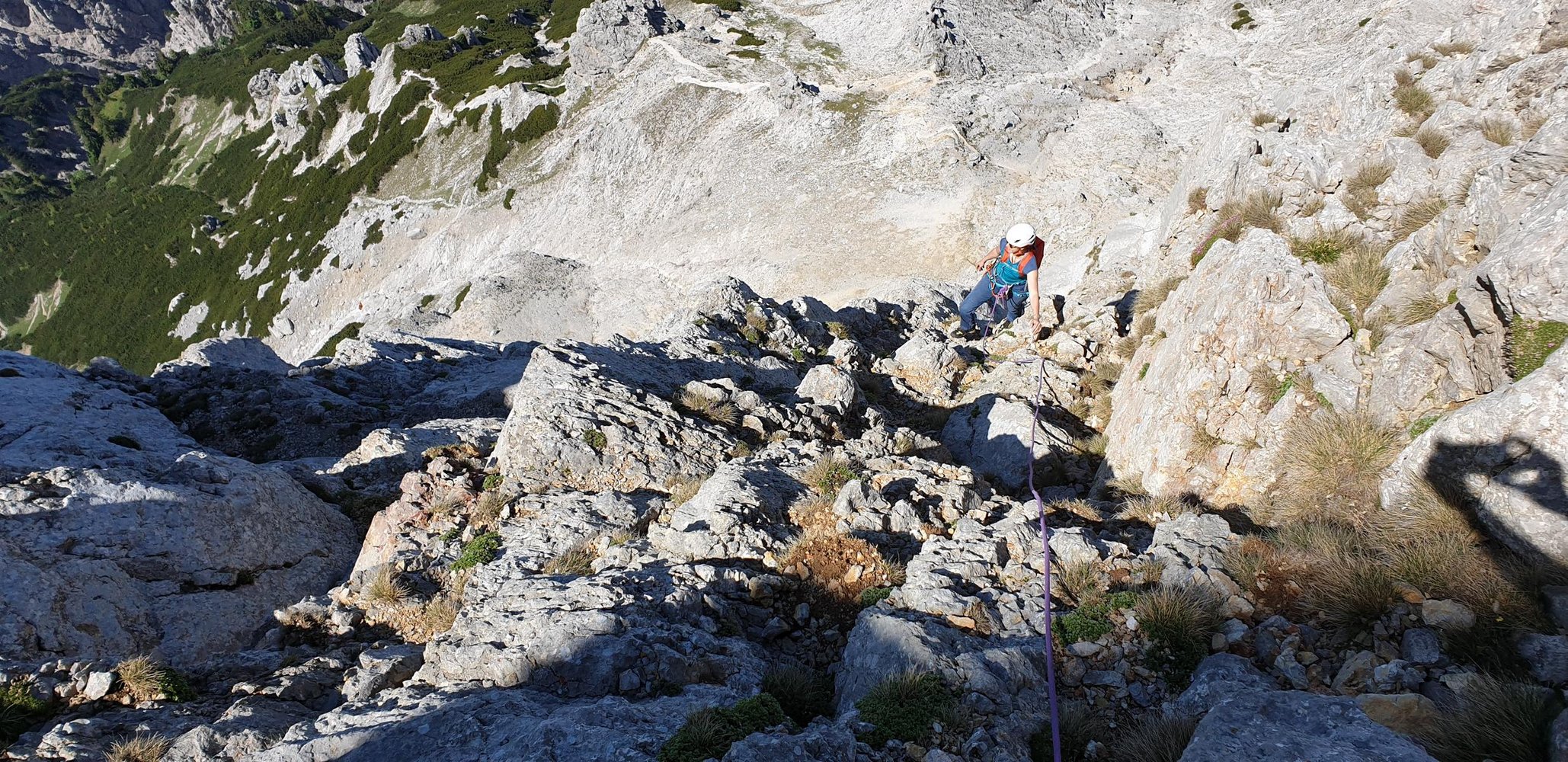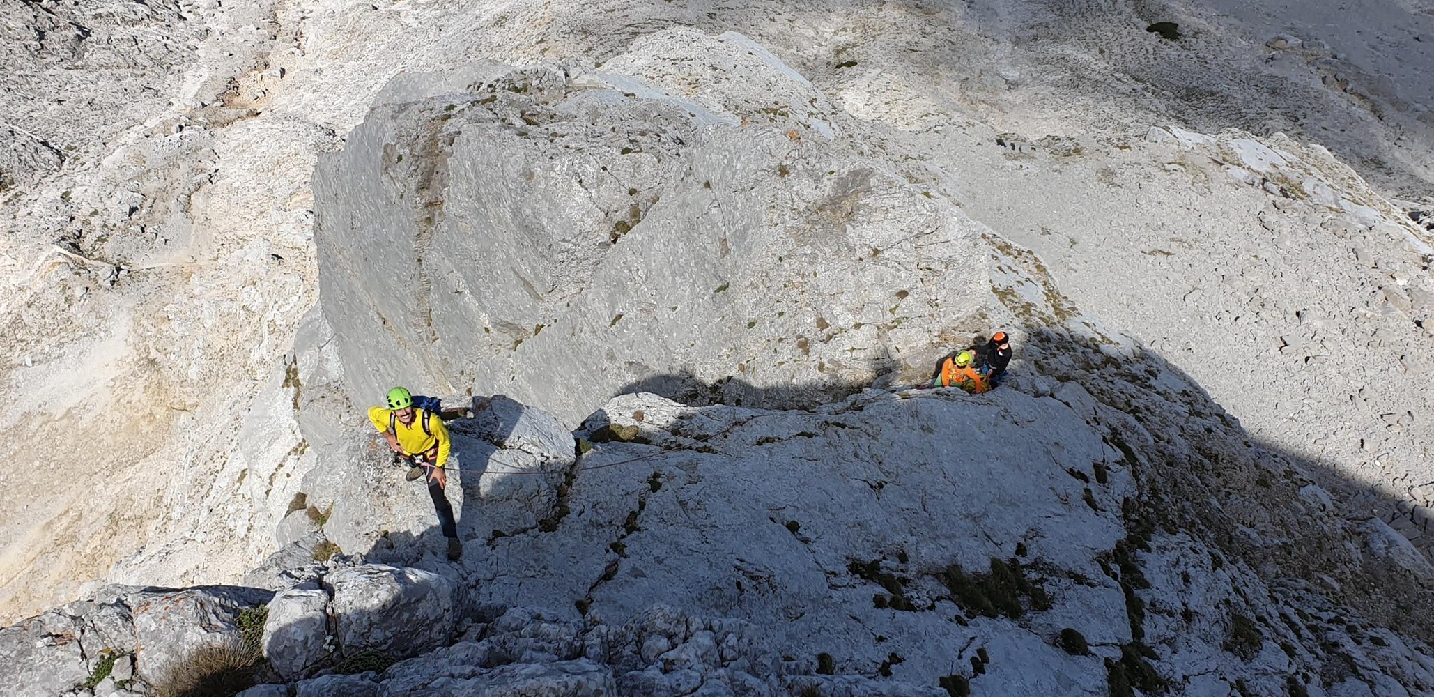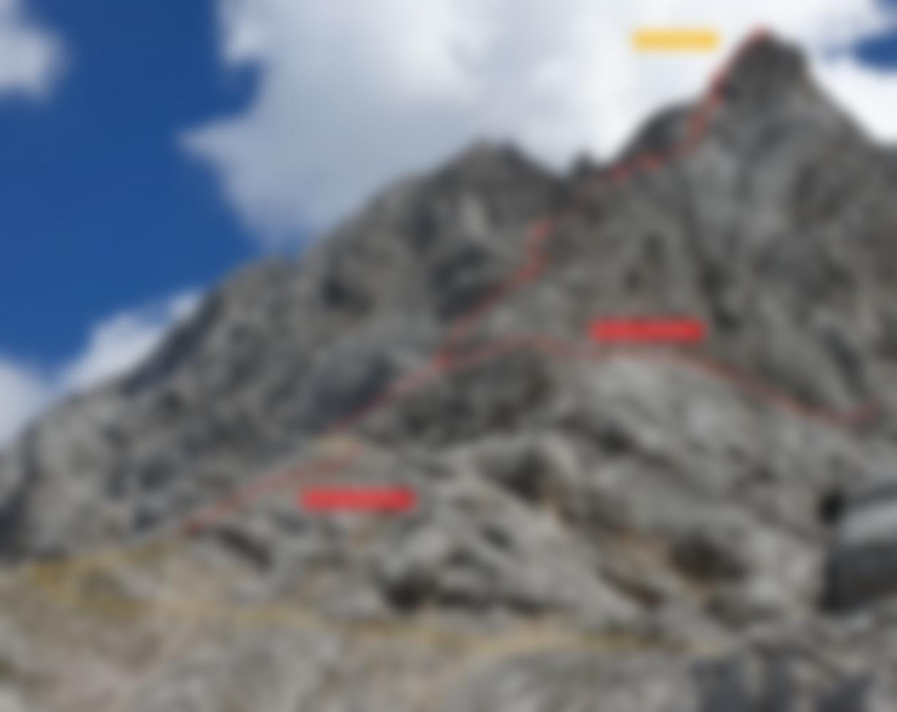 50 m Einfachseil, 6 Expressschlingen, ein Klemmkeilgrundsortiment, einige Bandschlingen und Helm. Für den Abstieg über den Klettersteig, Klettersteig-Set.