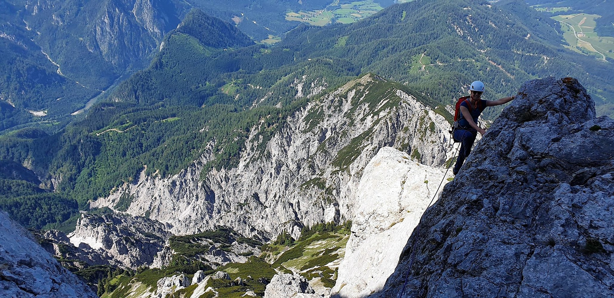 Der Westgrat auf den Großen Buchstein ist der beliebteste Anstieg auf den Gesäuse-Paradeberg in diesem Schwierigkeitsgrad. Der genussvolle Grat bietet ausgesprochen schöne, ausgesetzte, abwechslungsreiche Kletterei an festem Fels und einen großartigen Ausblick auf die gesamte Hochtor-Gruppe. Die Gratroute ist für diesen Schwierigkeitsgrad sehr gut mit Bohrhaken abgesichert und zweigt vom Südwand-Klettersteig in Richtung Gipfelkreuz ab. Vom Tal aus ist die Tour durch den langen Zustieg konditionell ziemlich fordernd. Wer es gemütlicher mag, steigt am Vorabend auf und nächtigt im Buchsteinhaus. Vor Tourenantritt kann man über dem Hochtor den Sonnenaufgang bestaunen.