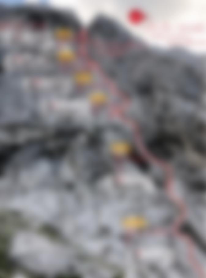 Die Route folgt einer logischen Linie durch die Ostwand und ist mit M10 Bohrhaken relativ gut abgesichert. In den leichteren Passagen müssen jedoch auch größere Abstände zu den Haken überwunden werden. Zur zusätzlichen Absicherung können Camalots Gr. 0,5-1 zum Einsatz kommen.
