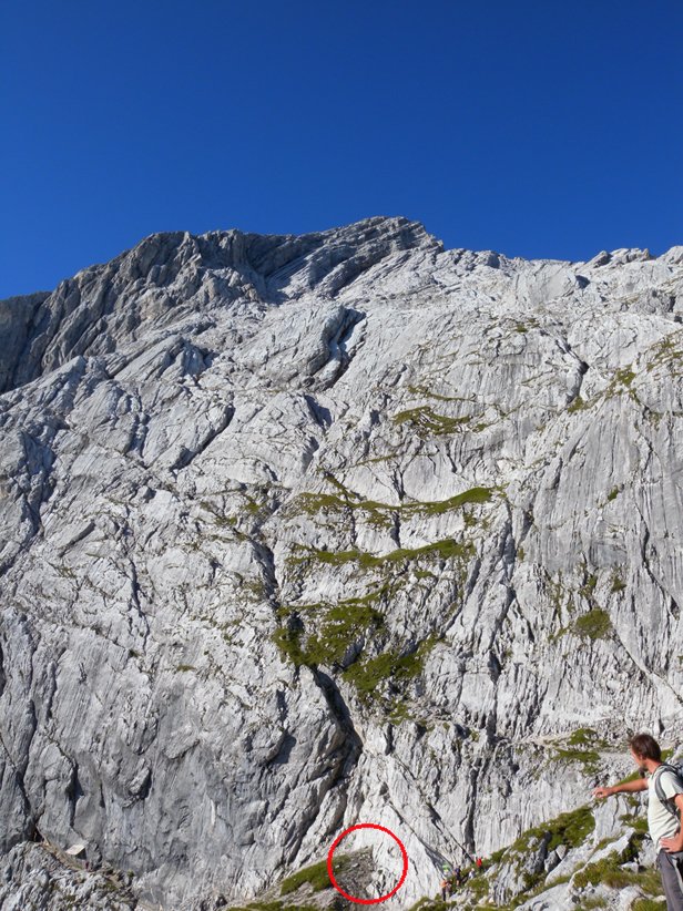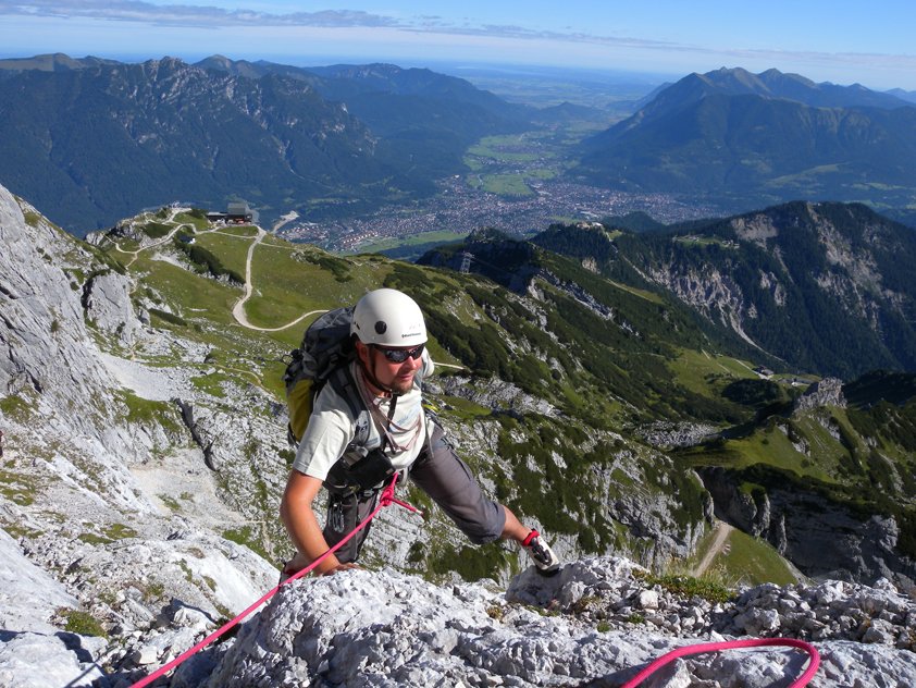 Wenn viele Leute in der Wand sind, sollte man den Helm schon beim Abzweiger Alpspitz-Ferrata aufsetzen. Bei viel Andrang auf dem Klettersteig, kann der Abstieg etwas mühsam werden.