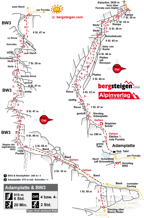 Vom BW3 Ausstieg auf dem Schuttfeld nach rechts zum Kettersteig Alpspitz-Ferrata und auf diesem absteigen und zurück zur Seilbahn. Wer die Adamplatte weiter klettert, steigt im Schutt zu einer Tafel rechts vom sogenannten Herzl (oft Schneefeld) auf. Weiterweg Adamplatte siehe Topo und eigene Tourenbeschreibung.