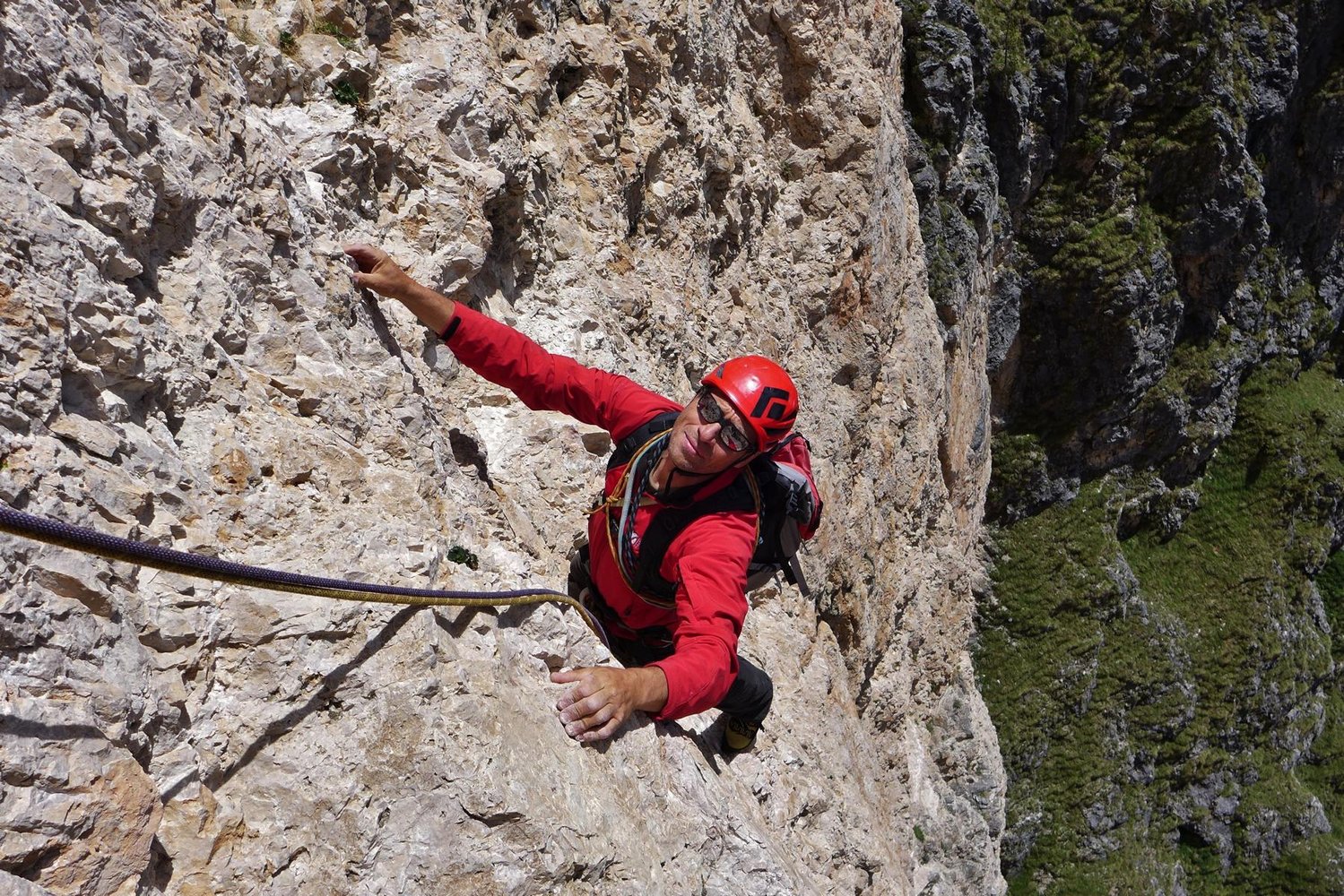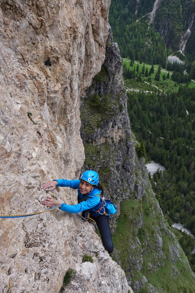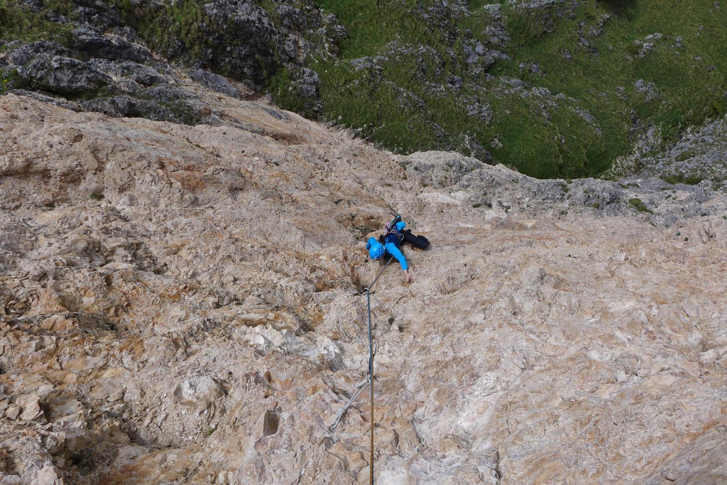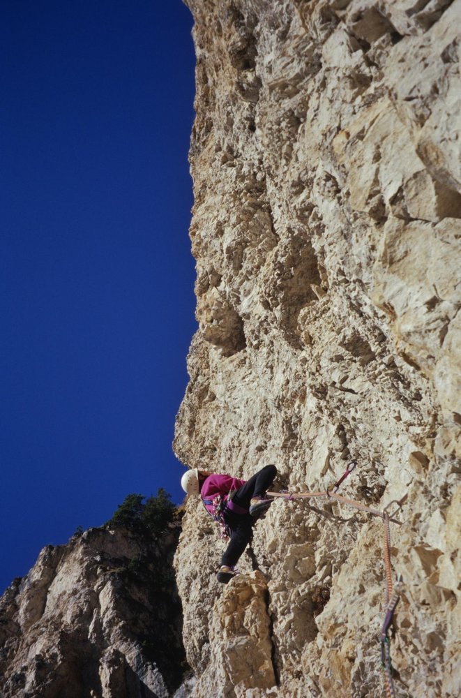 Als Grödens Seitental, bietet das Langental nicht nur ein Wanderparadies oder ein ideales Betätigungsfeld für Eiskletterer, sondern auch sämtliche Routen in idyllischer Geborgenheit. Der kleine Bruder des bekannteren Ciampanil de Val weist mit seiner gelb leuchtenden Südwand eine anständig steile Kletterei, die auf Grund der geringen Höhe auch als ideale Frühjahr oder Herbtstour gilt. Wegen der raschen Zu- und Abstiege, bei zeitigem Aufbruch auch als Vormittagsbeschäftigungen bei gewittrigem Wetter möglich. Die Route folgt den Weg des geringsten Wiederstandes, mitten durch den sonnigen Abbruch. Die fein strukturierte Wand erfordert abwechslungsreiche Bewegungsmuster, sowie technisch interessantes Ausdauerklettern. Athletische Passagen bilden die beiden Schlüsselstellen. Der teilweise splittrige Fels ist noch nicht völlig abgeklettert, die relativ gute Absicherung wirkt aber beruhigend. Weil es hinterher auf gleichem Weg hinabgeht, kann man sich auch bei unsicherem Wetter in die Route wagen.