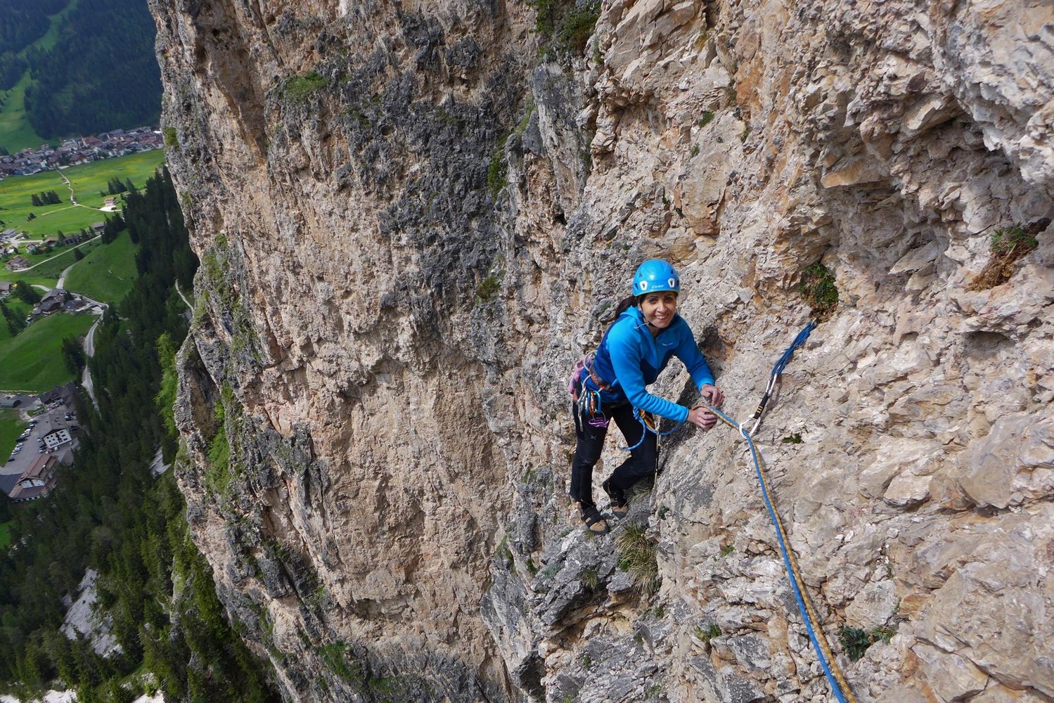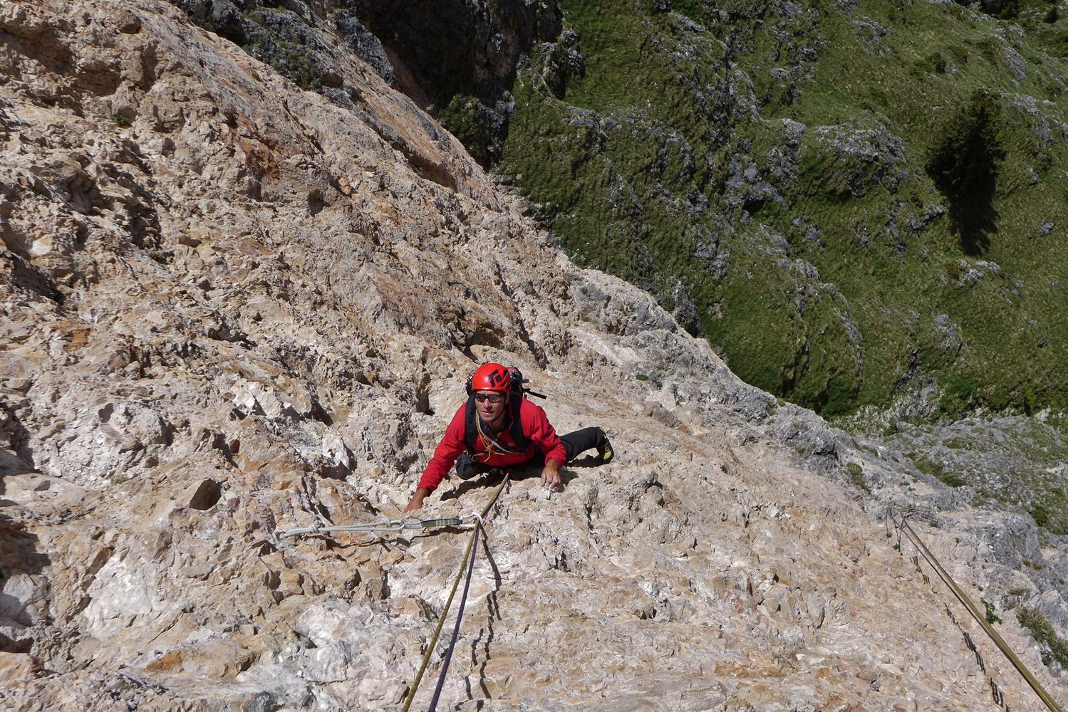 Vom Parkplatz auf Pfadspur im Wald, wobei man bald auf den »Kreuzweg« trifft, dem man kurz nach rechts verfolgt. Weiter auf dem Steig bergan und über steile Wiesenhänge unter dem Ciampanil de Val ansteigen. Einstieg bei geräumiger Nische unter grasigen Steilrampe (½ Stunde).