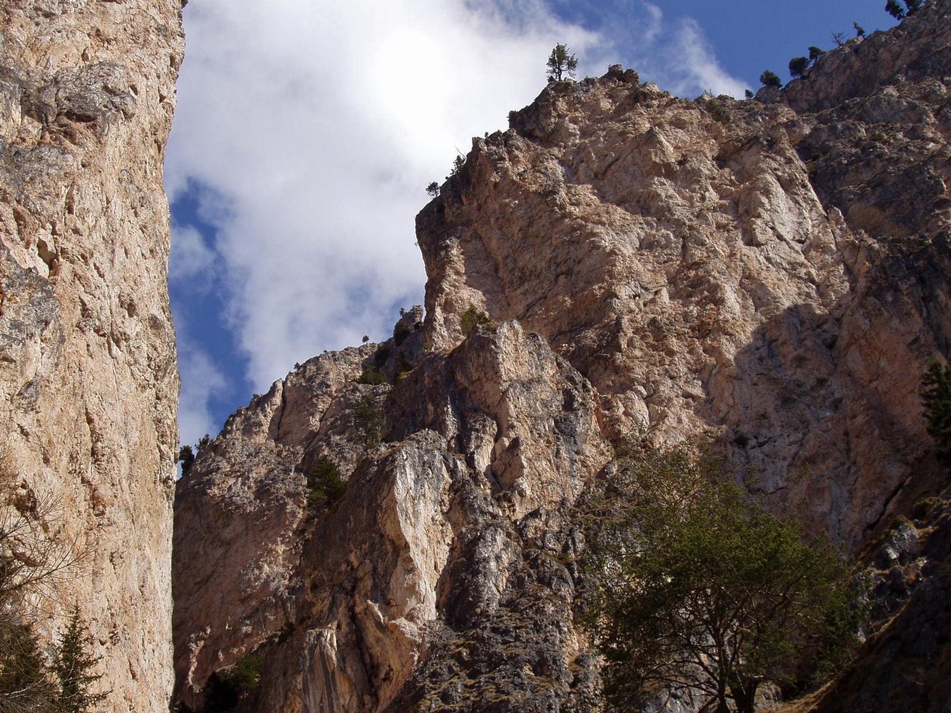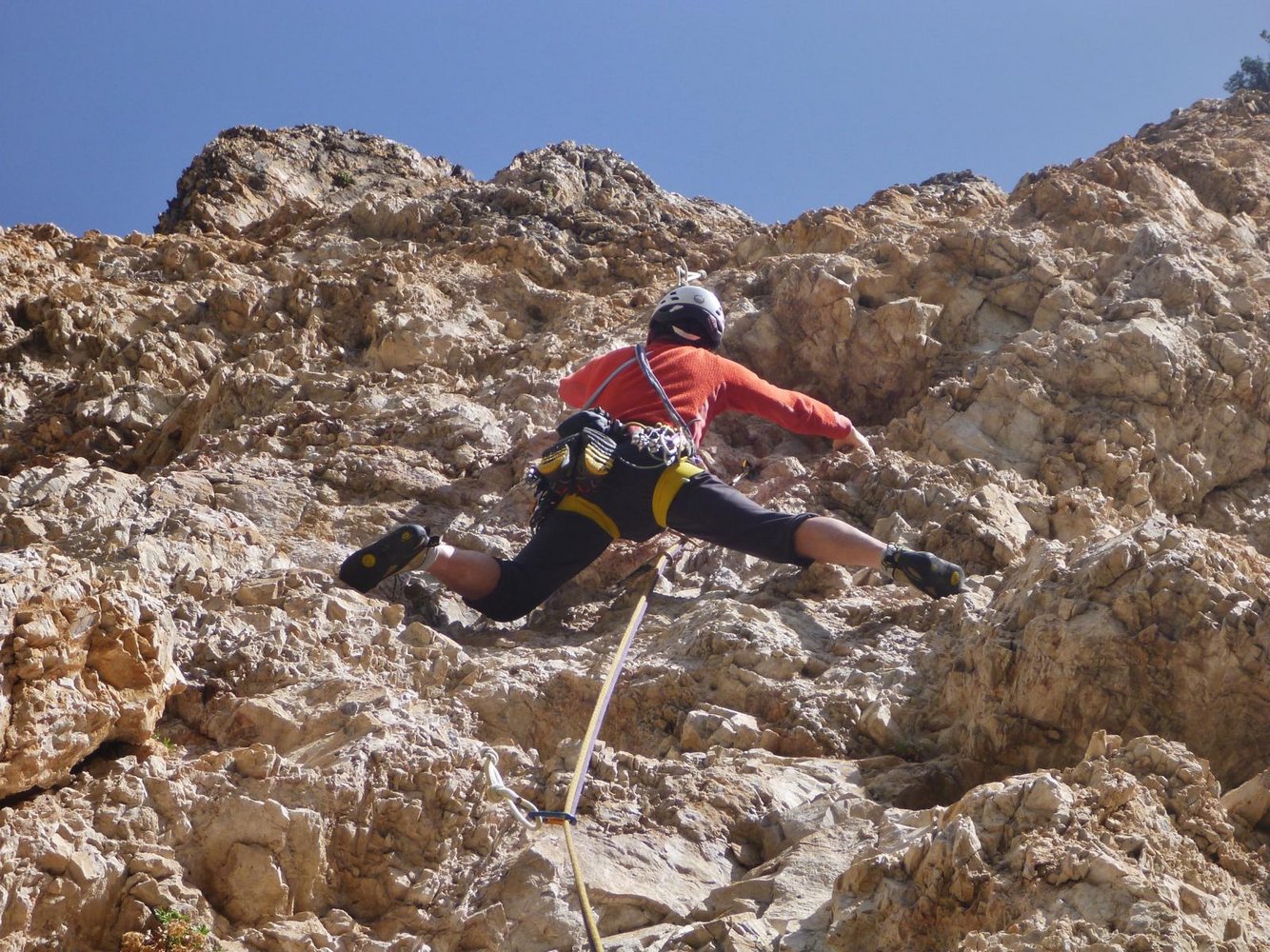 Vom Gipfel (Wandbuch) über die Aufstiegsroute abseilen (35 m, 50 m, 35 m, 40 m, 35 m) hinab zum Wandfuß. Auf dem Zustiegsweg zurück zum Parkplatz.