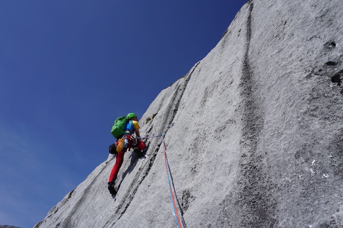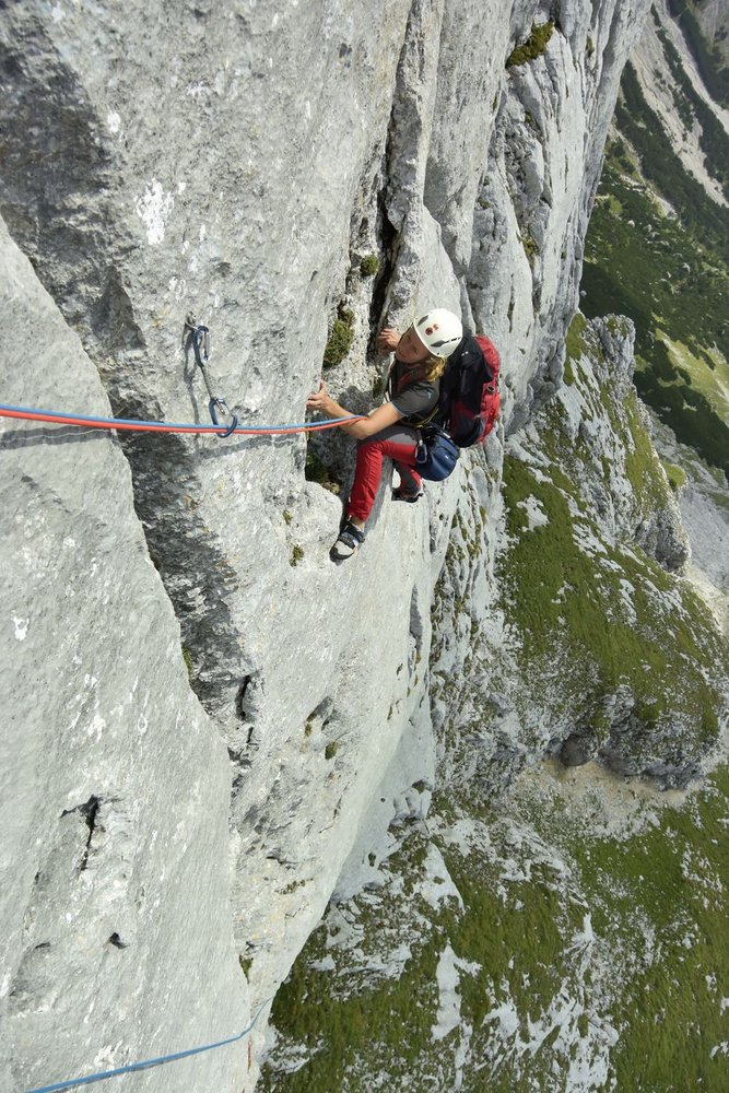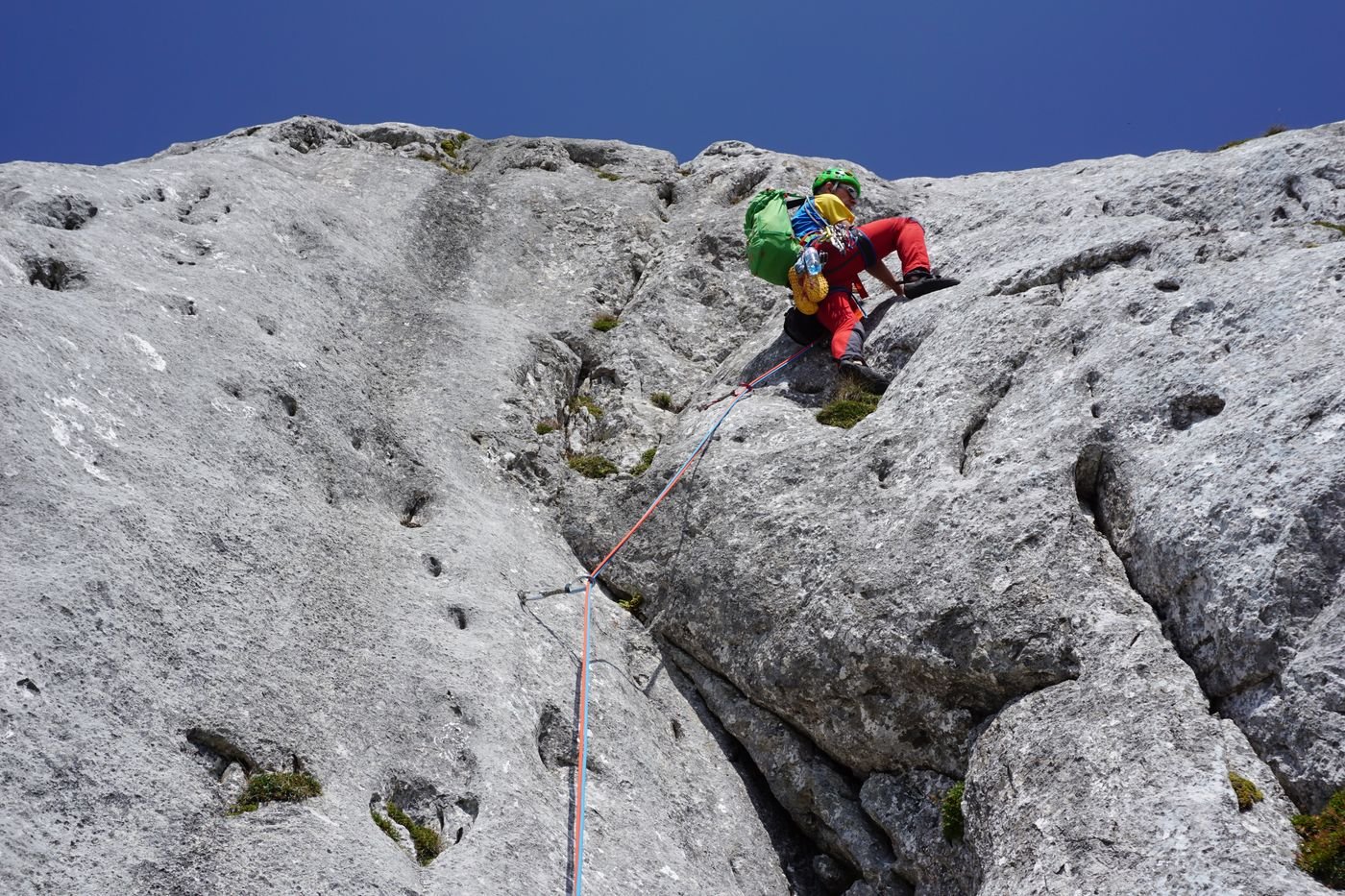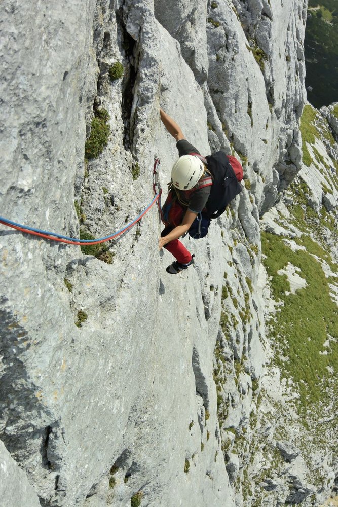 Steile, sehr ausgesetzte alpine Sportkletterei mit sehr guter Absicherung (Expansionsbohrhaken)