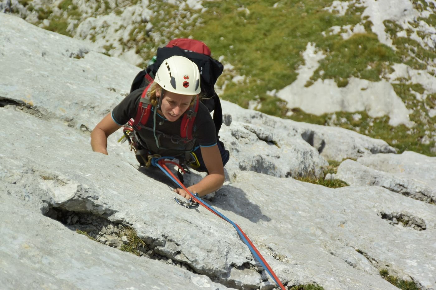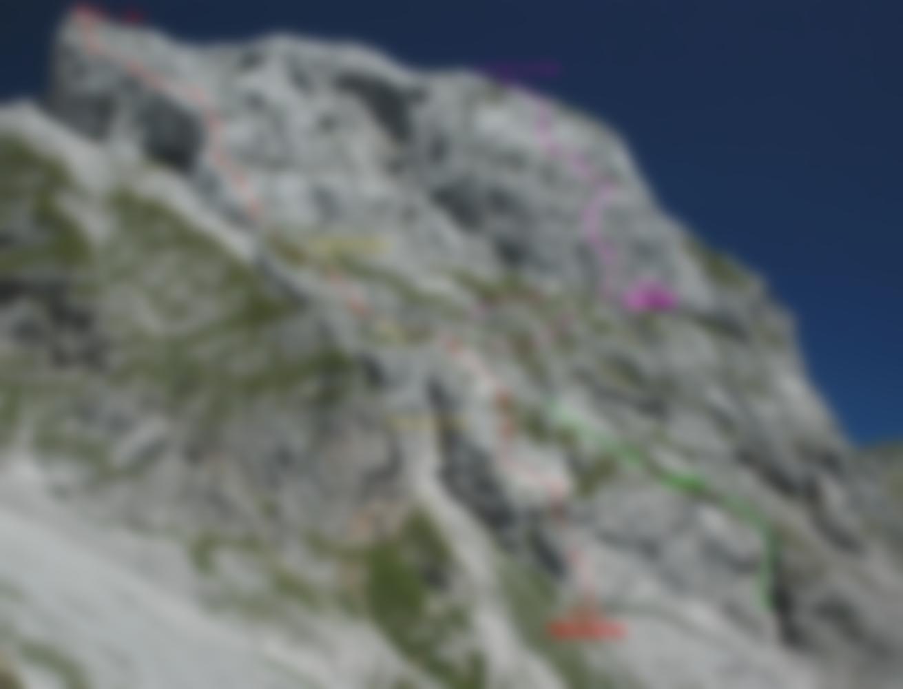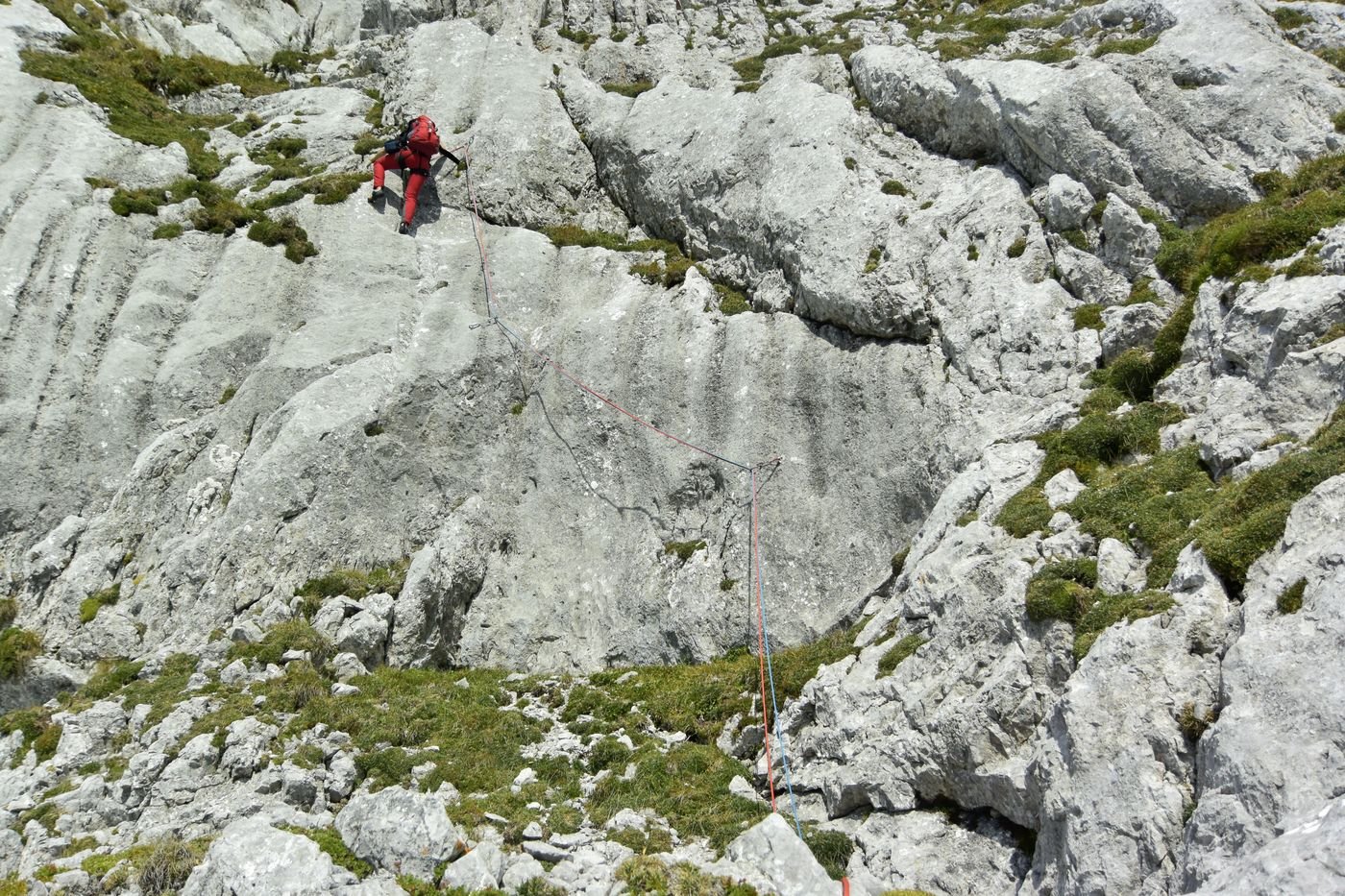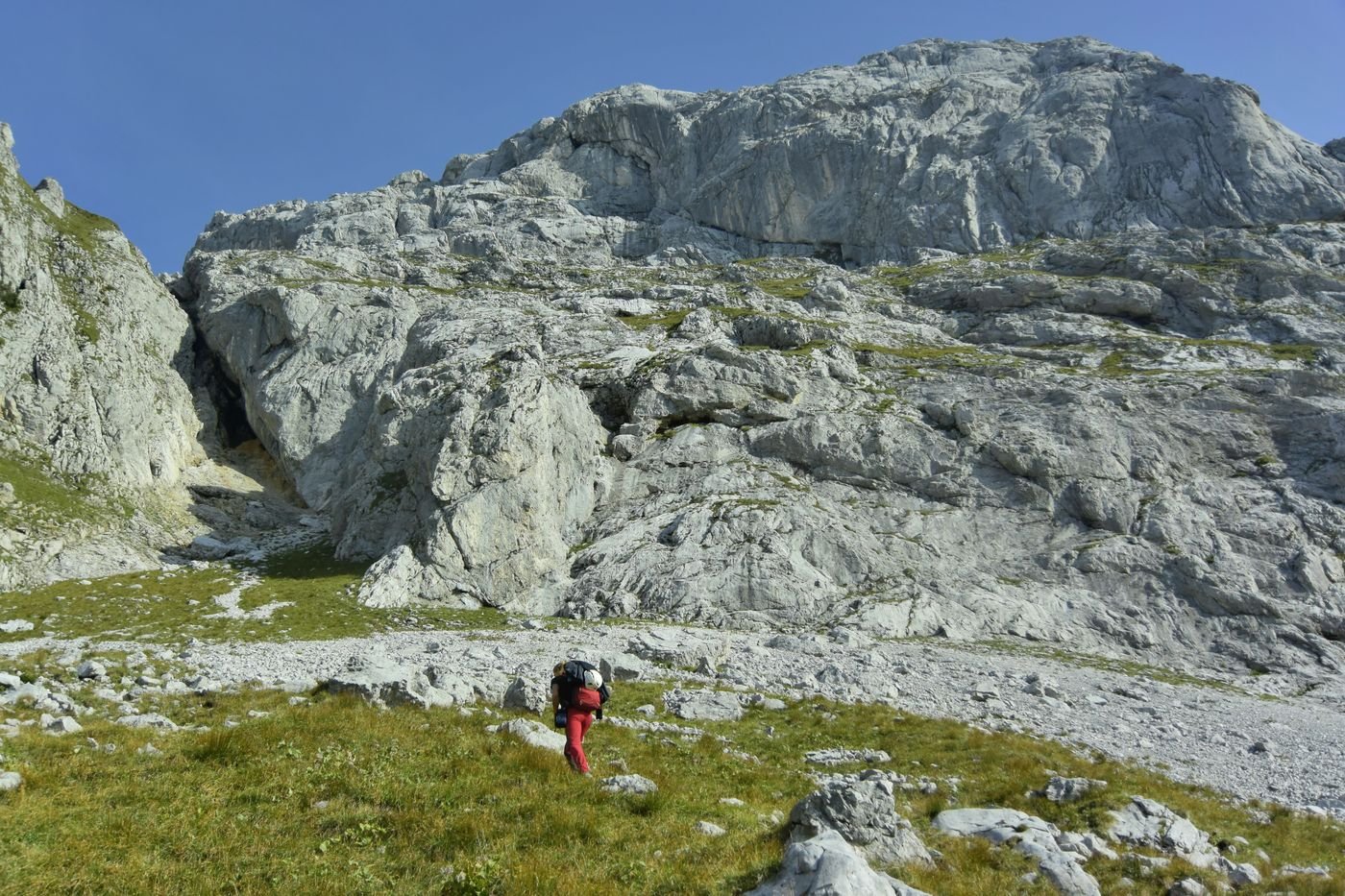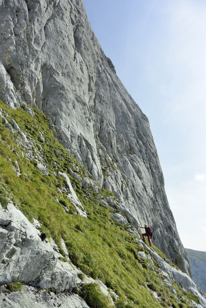 Der „Glückskind“ folgen bis ans Ende der 4. ODER 5.SL. Hier etwa 150 m schräg rechts über den schrofig-grasigen Mittelteil der SW-Wand zum Fuß einer äußerst steilen Plattenwand. Einstieg in Nische über einer Schrofenrinne.