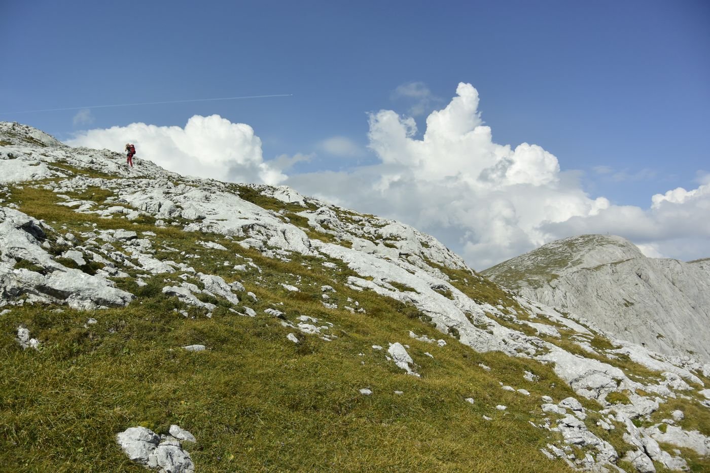 Vom Ausstieg in 10-15 min. über das grasige Plateau ansteigend nach Norden bis zu einer kleinen Einsattelung nahe dem Gipfel (hier Gipfelbuch). Nun nordseitig absteigen (Vorsicht bei Nässe oder Schnee: Unter den Steigspuren, die auf der Nordseite zuerst nach links führen, befindet sich eine Doline mit überhängendem Abbruch!), und nach Erreichen der Wiese rechtshaltend zum Hochschwab-„Normalweg“ übers G´hackte. Vom Gipfelbuch bis hierher nur etwa 4 min.!