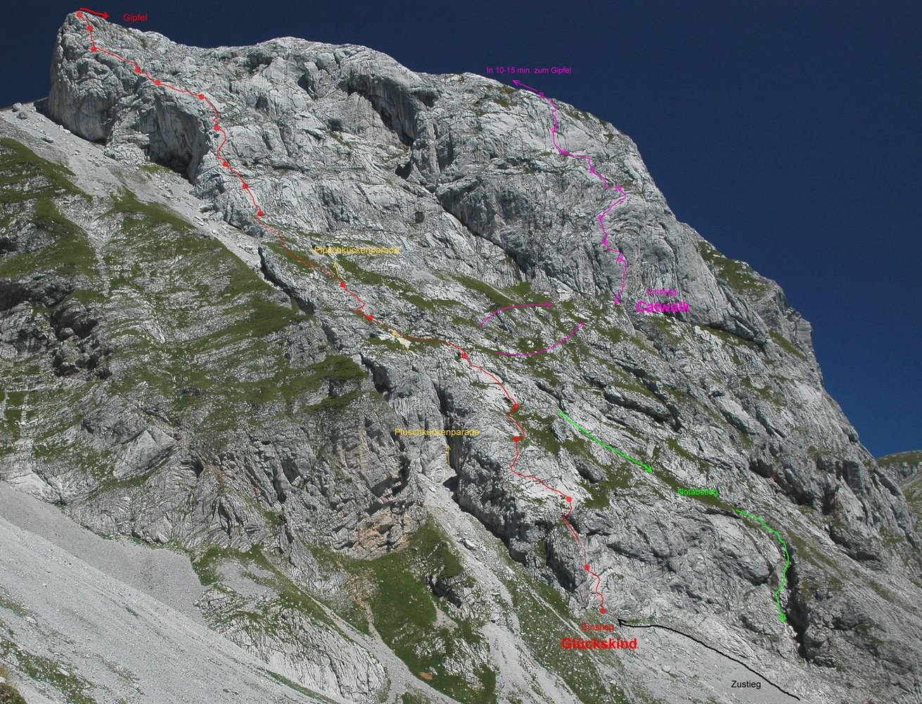 Die 5 Seillängen der "Glückskind" erfordern hinsichtlich der Routenfindung eine gewisse Aufmerksamkeit und Beachtung des Topos. Nach Überquerung des Rasen-Schrofengürtels in der Mitte der SW-Wand und dem Auffinden des eigentlichen Einstieges der "Catwalk" (siehe Wandfoto) ist ein Verfehlen auf Grund der guten Absicherung allerdings kaum mehr möglich.