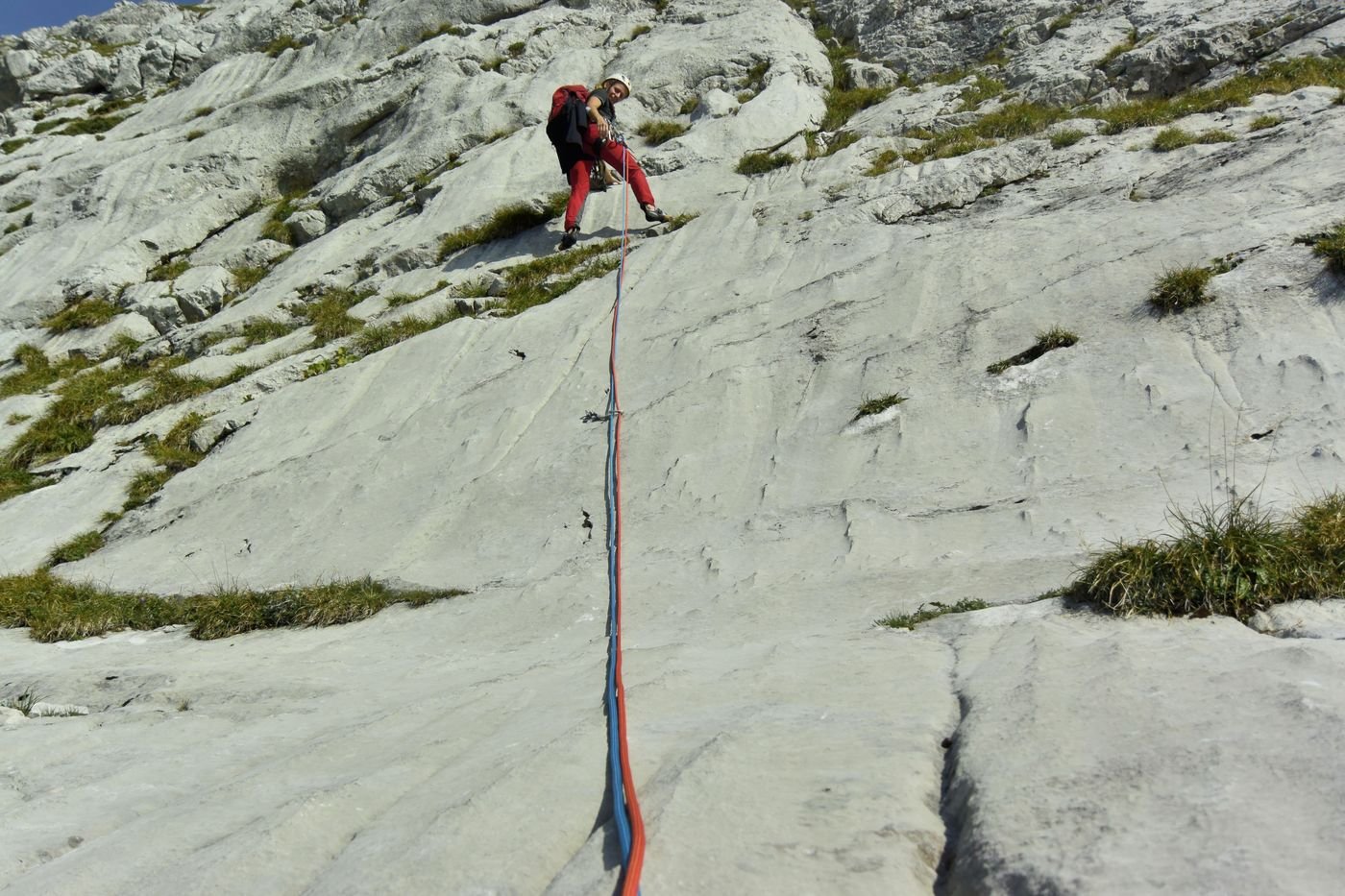 Fluchtmöglichkeit: Vor Beginn der "Catwalk", nach der 4. oder 5. SL der "Glückskind" nach rechts ins grasige Schrofengelände und Abstieg über Steilwiesen und eine Schrofenschlucht (1-2) zum Wandfuß gut 100 m rechts (südlich) des Einstieges. Keine Sicherungsmöglichkeiten, bei Nässe gefährlich!
