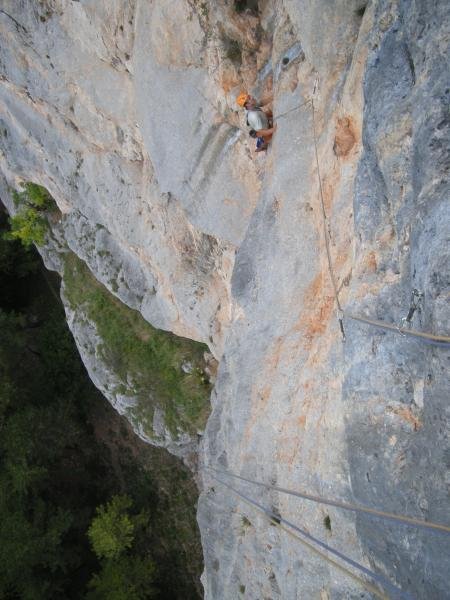Über Wildenauer (Klettersteig D) zurück zum Einstieg. Mann kann auch mit 60 m Doppelseil vom Ausstieg bis auf den ersten Grasabsatz abseilen, man muss aber in der letzten u. vorletzten SL einige Bolts einhängen, damit man den Absatz erreicht!