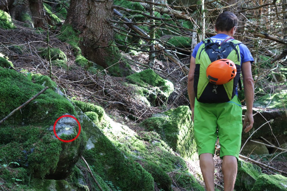 Von der 2ten Kehre links der Beton-Straßenmauer am Rand der Wiese zum Wald hinauf folgen. Man folgt der klein gelben Punktmarkierung (kleine gelbe Punkt auf den Felsen) und gelangt auf Pfadspuren direkt zum Einstieg der Touren im linken Sektor. Zum rechten Sektor quert man ca. 200 m unterhalb der Felsen nach rechts. Touren sind tlw. angeschrieben.