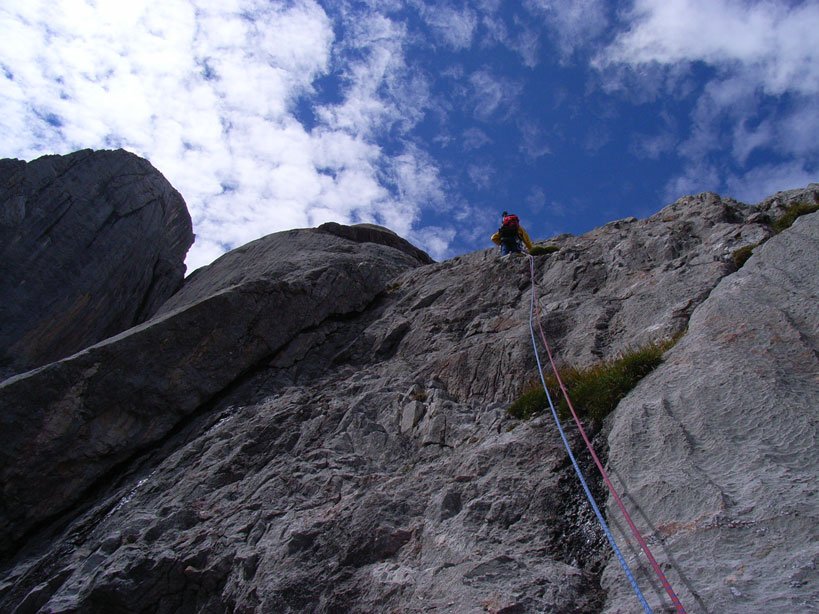 Route ist gut mit BH abgesichert. Ein Satz Keile und Friends bis Größe 3 sind notwendig!
