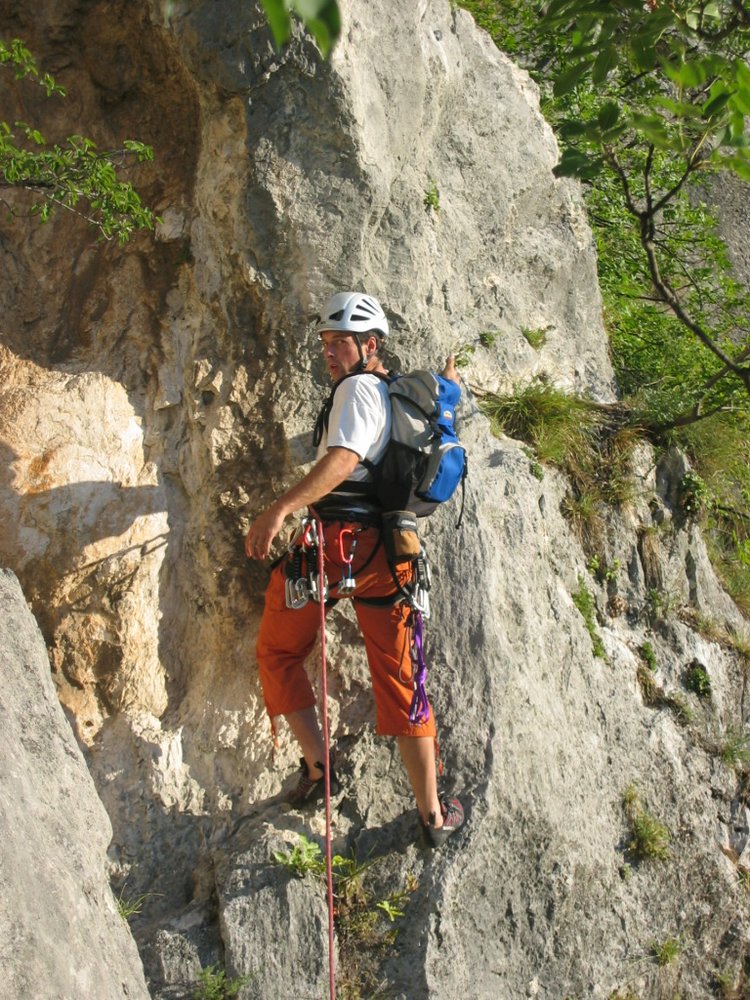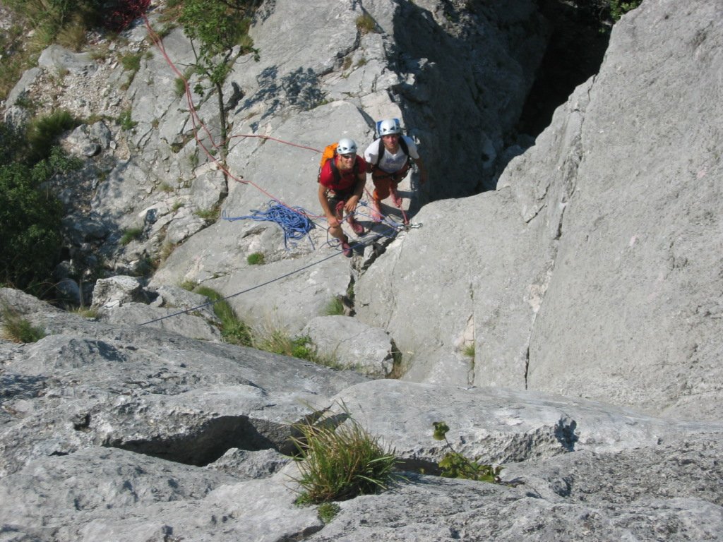 Früher konnte man nach dem ersten Teil zur Straße unterhalb von Laghel absteigen. Dort wurde jetzt eine Villa gebaut und der Besitzer will keine Kletterer auf seinem Grund haben - es wurde ein Zaun gebaut.