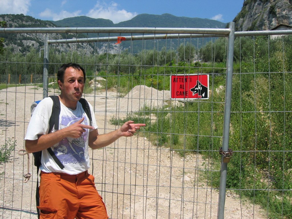 Vom Campingplatz (Camping Arco) kurz auf der Straße zurück in Richtung Arco - es zweigt rechts eine Straße zu einer Kapelle ab. An der Kapelle vorbei bis man zu Buschwerk kommt. Dort rechts in Richtung Felswand, dann aber links entlang der Felswand bis man zu einem Gartenzaun mit Türe gelangt. Durch diesen Garten hindurch und nach rechts zum Einstieg an einer flachen Plattenrampe links von der Wasserleitung aufsteigen. Man sieht den ersten Bohrhaken etwas weiter oben.