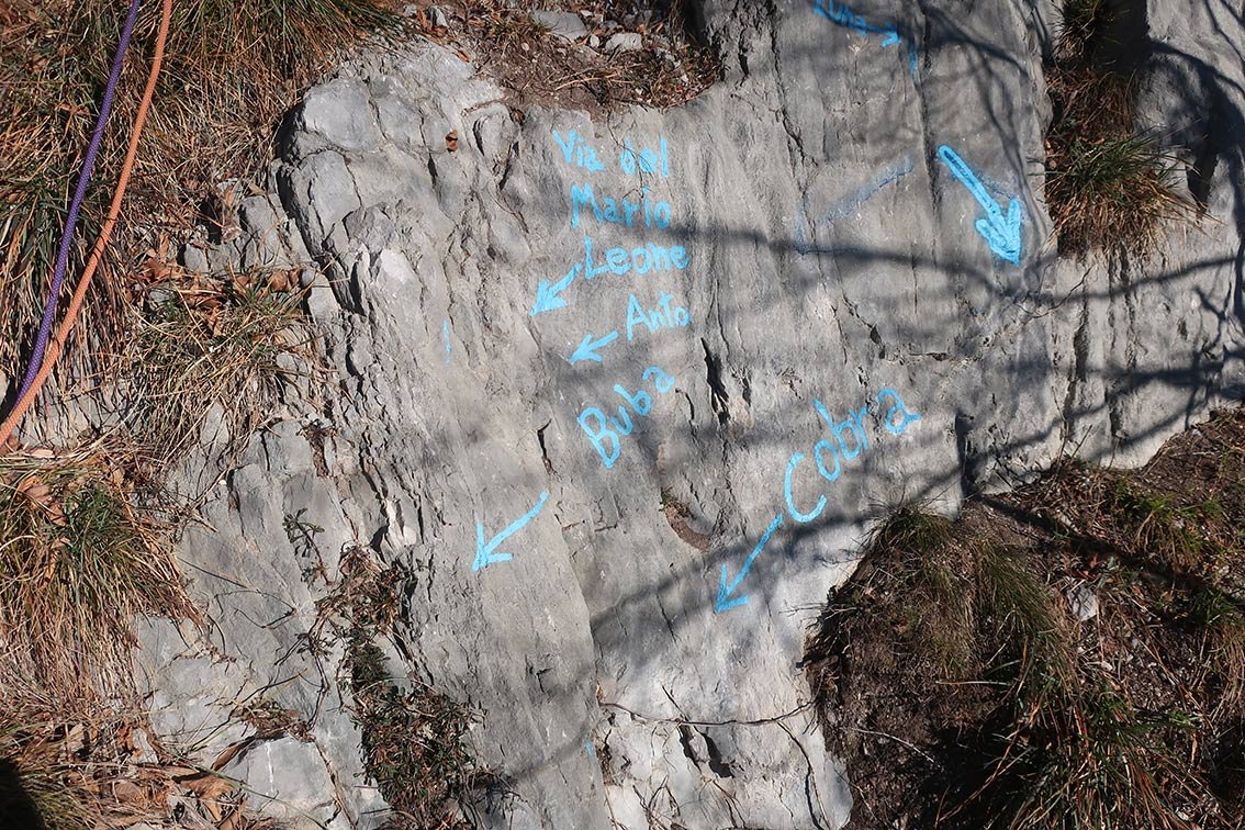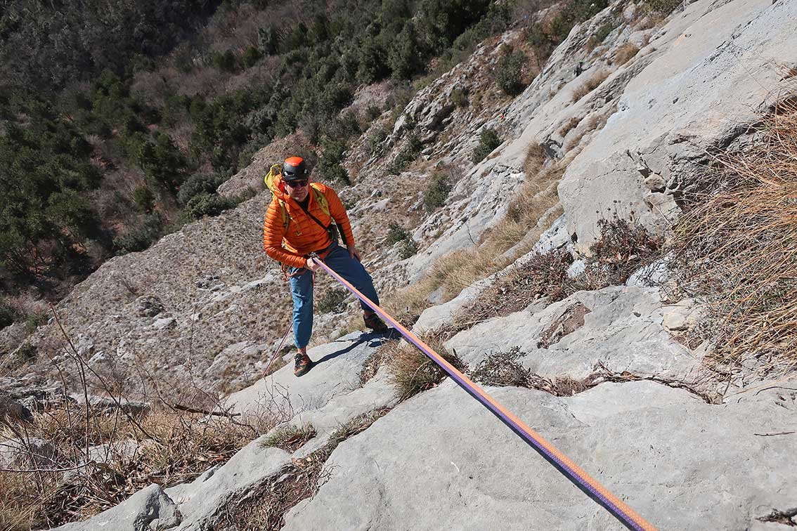 Von der Parkbucht beim Wanderweg nach Margone auf der Straße in Richtung Vezzano zurückgehen. Man kommt zu einer Kette mit der Aufschrift Doppia (Doppelseil), Via Luna, Via Anton. Das ist die Hauptabseilpiste, dort seilt man 2 x 60 Meter ab. Unten dann am Wandfuß im gestuften Gelände in Richtung Ranzo (blaue Punkte), am Ende über eine kleine Stufe mit Fixseil zum Einstieg ab klettern. Die Tour ist angeschrieben.