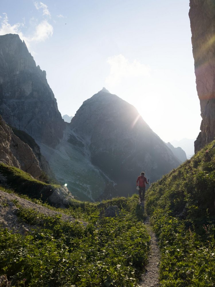 b.) Abstieg über die Nordost-Schlucht (Gola NE) des Wischberg: Diese Variante ist eine weiteres kleines Abenteuer, teils sehr ausgesetzt und erfordert absolute Trittsicherheit. Außterdem erst spät im Jahr machbar, da oft noch Schnee liegt. Vom Götterband quert man nach Westen (rechts) und quert dabei die Innominata (dt. Kleinspitz, Stahlseilversicherung bzw. Bohrhaken) bzw. den Gamsmutterturm (Torre delle Madri dei Camosci). So gelangt man in die Schlucht. Diese ist teilweise mit kurzen Klettersteigpassagen versichert. Gleich bei der Einmündung vom Götterband in die Schlucht beginnt (Blickrichtung Hütte) rechts ein Versicherter Abschnitt. Der Weg durch die NO-Schlucht verlangt Aufmerksamkeit und Konzentration - Absturzgefahr! Markierungen und Seilversicherungen sind ständigem Schneedruck ausgesetzt und können beschädigt sein. Nach schneereichen Wintern kann lange Schnee liegen- Steigeisen und Pickel mitnehmen! Abstiegszeit bis zur Hütte ca. 3-3,5 Stunden.