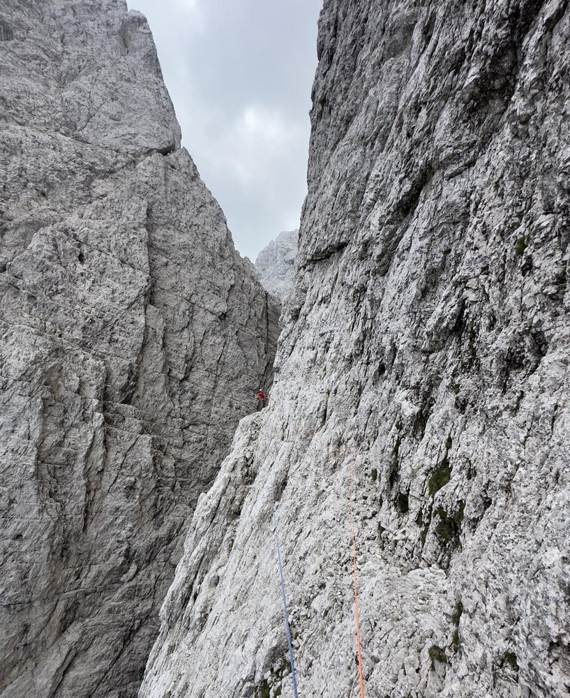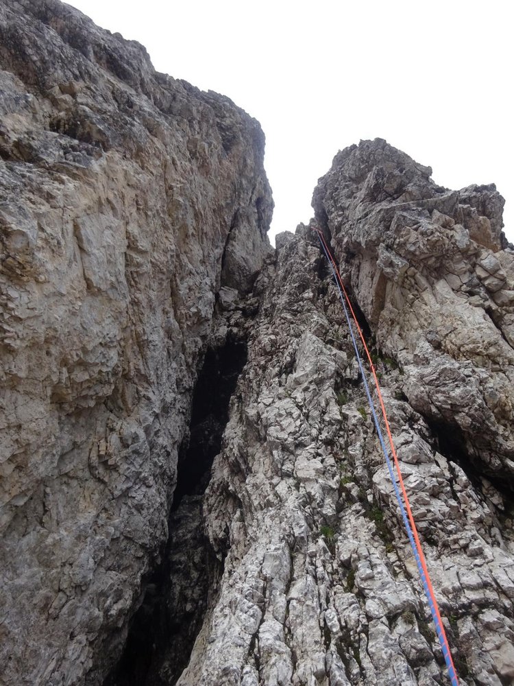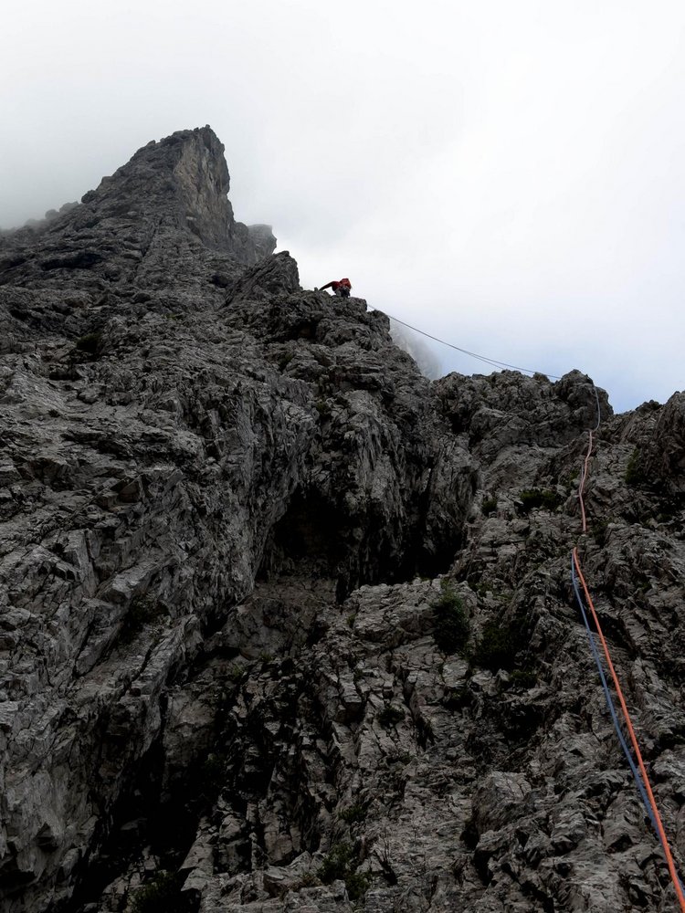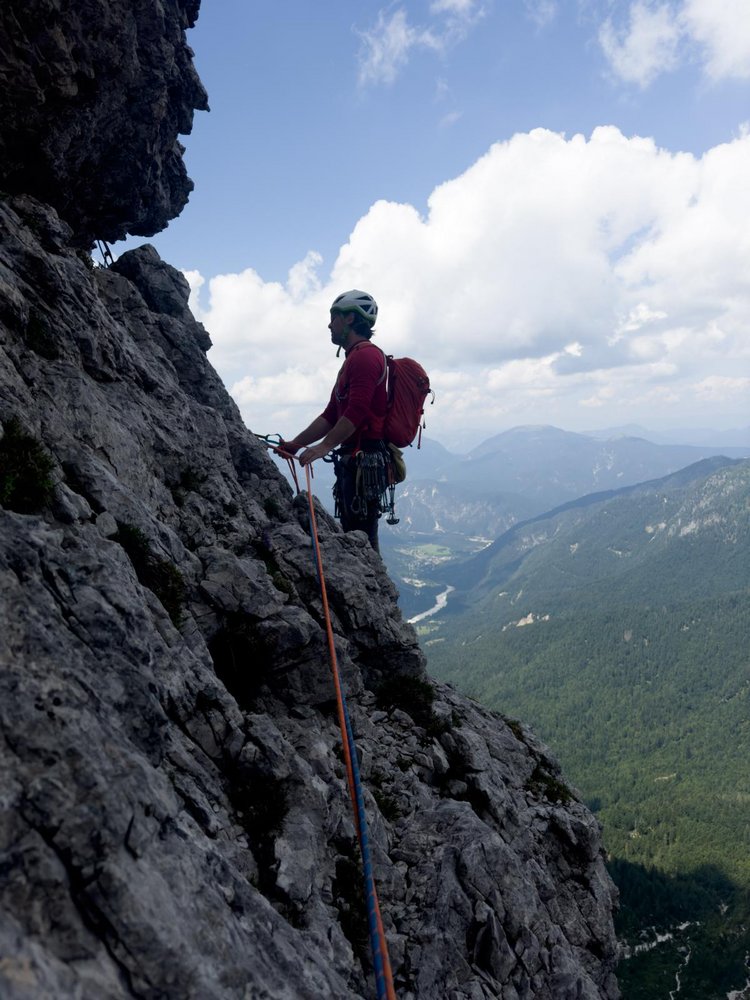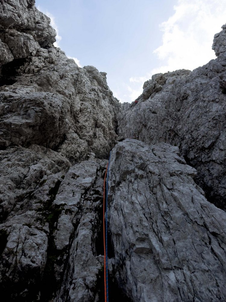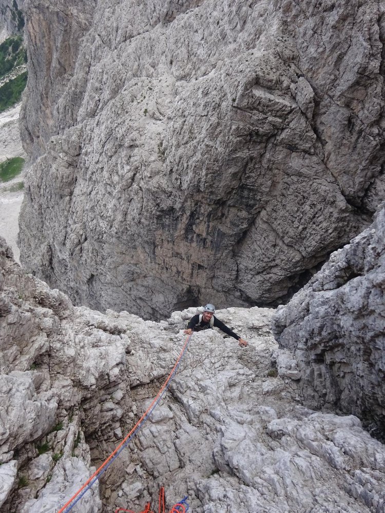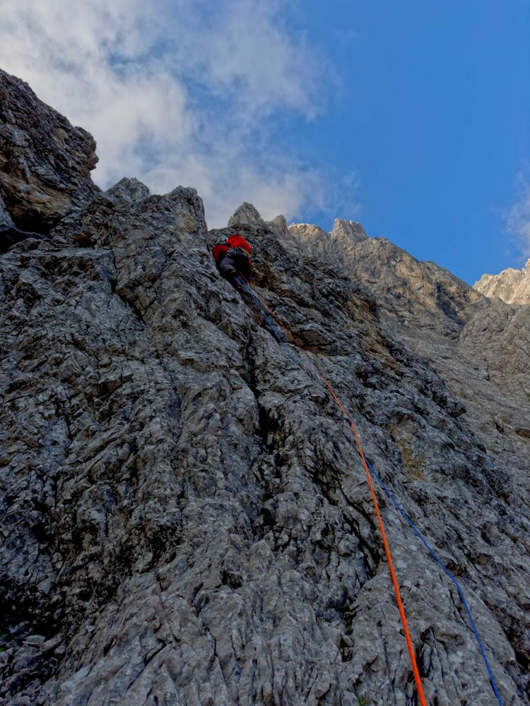 Die Comici-Fabjan, in Kärnten auch als Comici-Kante bekannt, ist eine klassische Julische Alpintour. Klassisch bedeutet, dass sie für den Schwierigkeitsgrad recht fordernd ist und dass der Fels kein Dachsteinkalk ist. Gerade in den leichteren Längen liegen lose Steine herum. Die schwierigeren Längen sind recht kompakt und lassen sich gut absichern. Insgesamt stecken in der Route wenige Haken, oft, gerade im oberen Teil, muss man auch die Stände selbst einrichten.