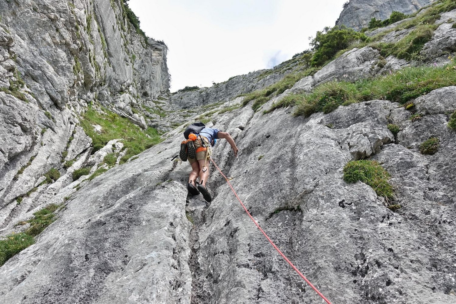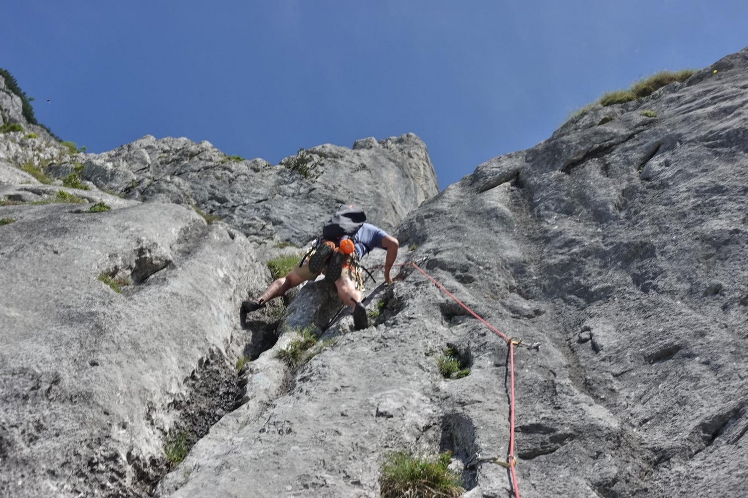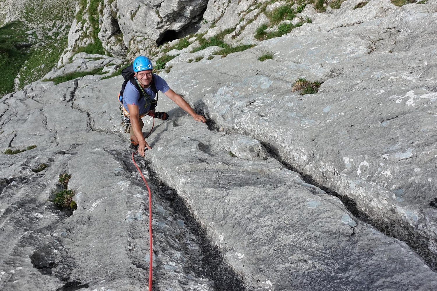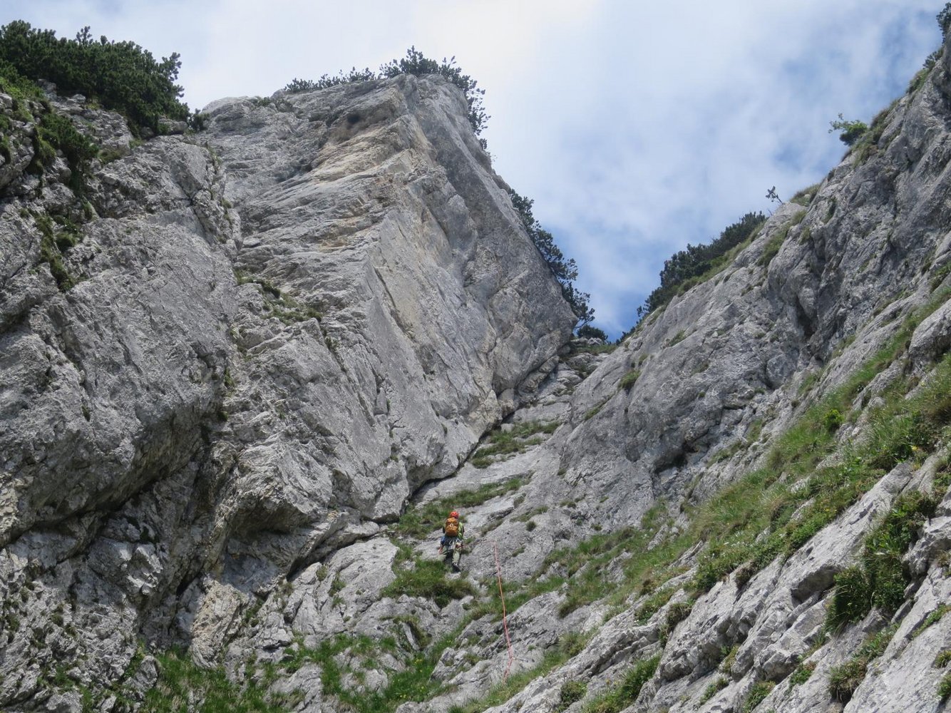 In den drei Zustiegslängen muss man den 1-2 Grad in teils brüchigen Schrofen beherrschen!