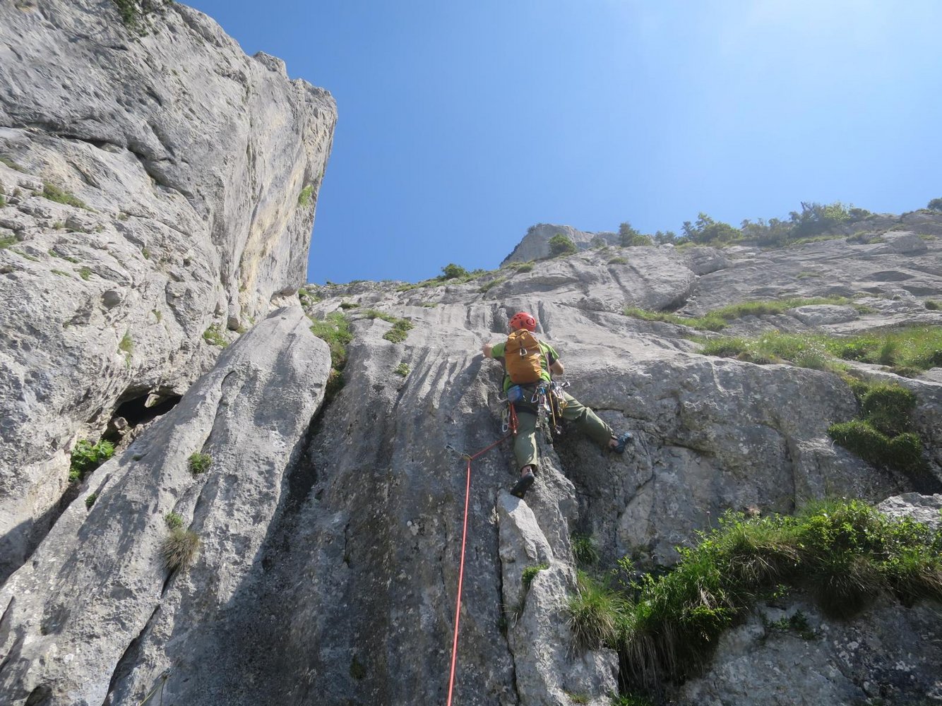 In den ersten drei Zustiegslängen steckt wenig und man kann kaum in den brüchigen Schrofen dazu sichern!