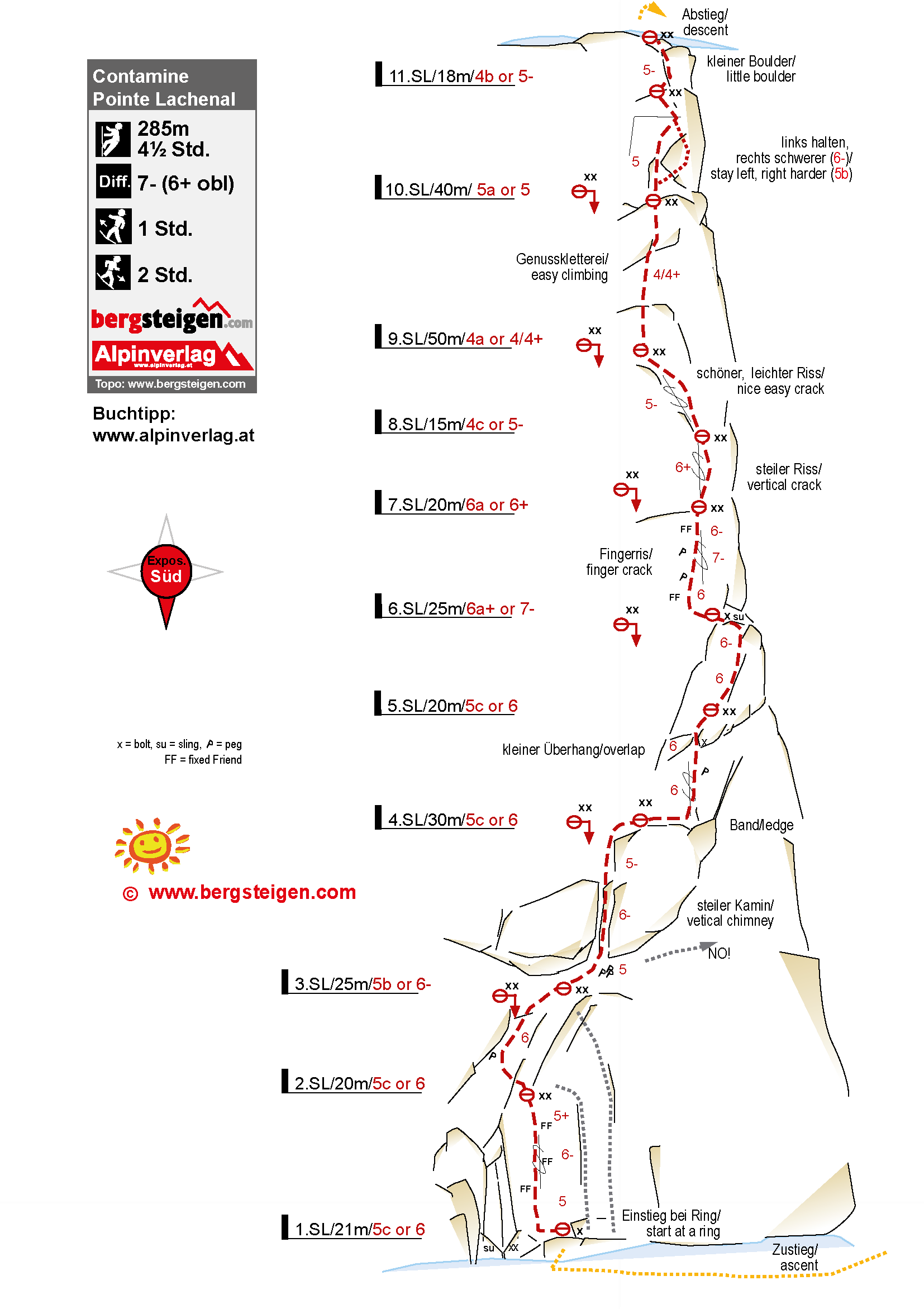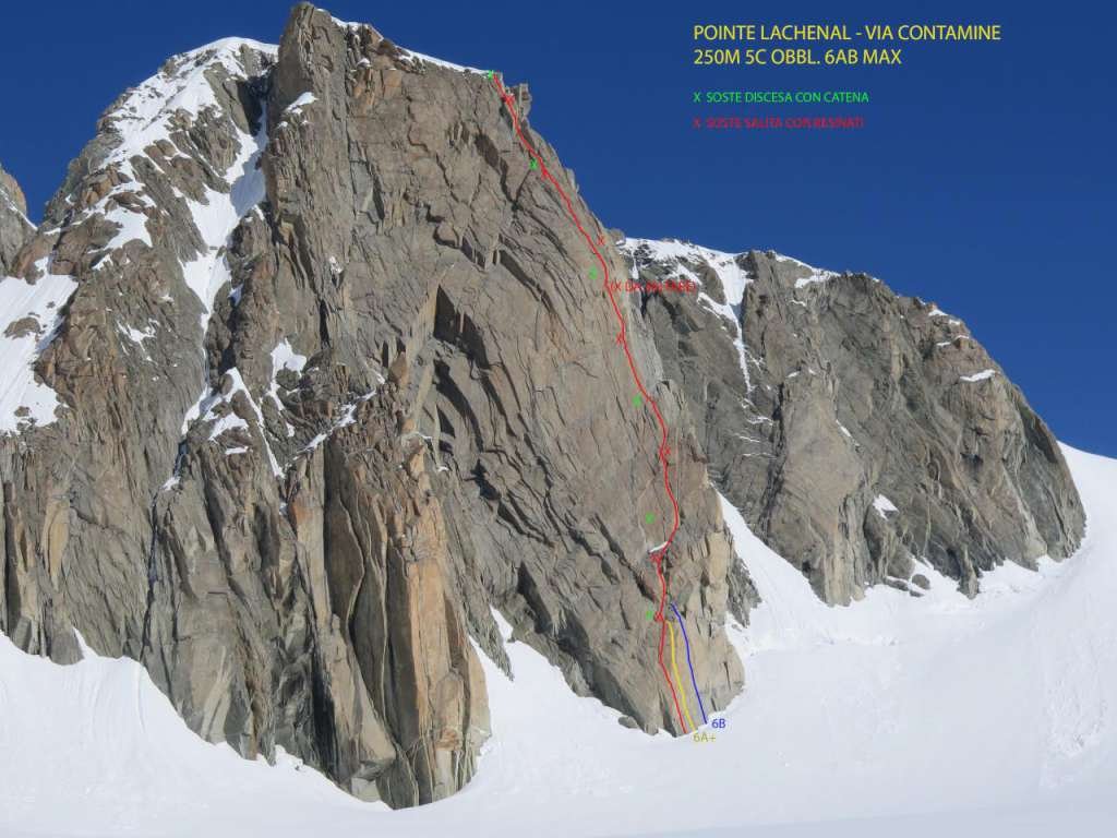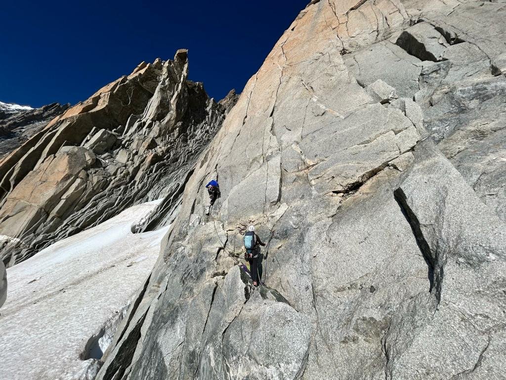 Wunderschöne Kletterei im Mont Blanc Massiv. Die Route schlängelt sich durch schmale und breite Risse den Point Lachenal rauf und man hat so gut wie nur fantastische Klettermeter. Man kann bequem oben aussteigen und zufuß zurück zur Midi oder Hellbronner gehen. Eine wirklich lohnenswerte Route.