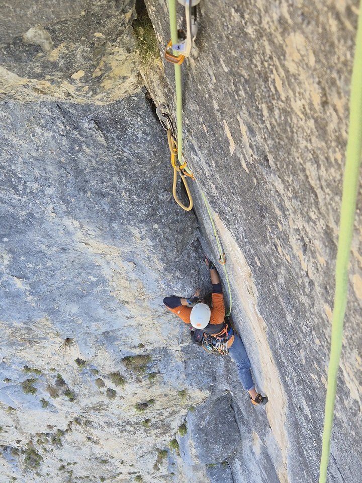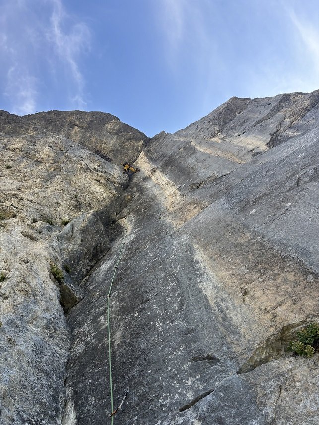 3SL 8+ oder 7+A0 30 m das Herzstück der Tour und bereits von weiten sichtbar. 30 m Riss klemmen, schieben schrubben. Zuerst senkrecht empor, oben zieht der Riss nach rechts und es wird nochmal richtig steil.