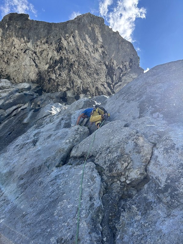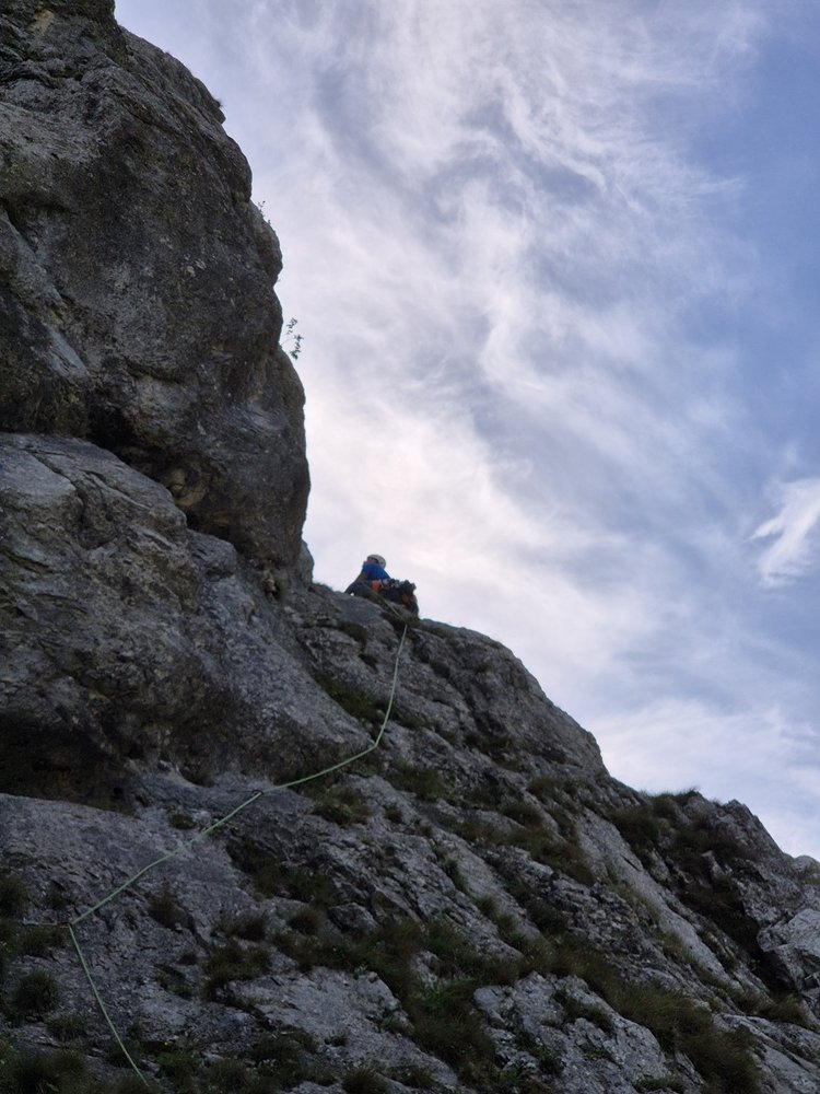 6SL 6/6+ 35 m zuerst Riss und Kamin bis zu einem kurzen brüchigen Überhang. Danach Schrofengelände bis zu Stand an Baum.