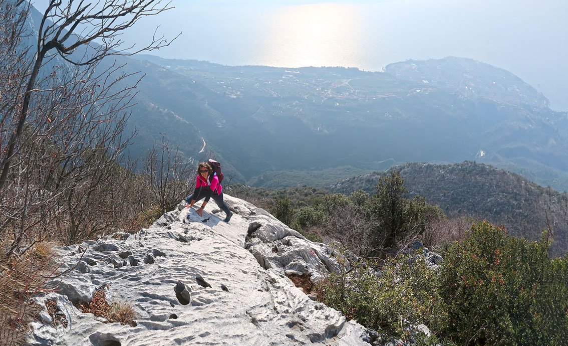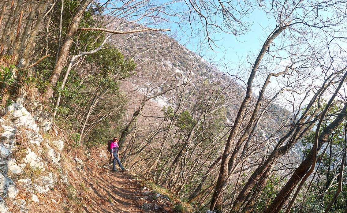 Von der Parkmöglichkeit "Ortello" 695 m folgt man dem Wanderweg 287 bis zur Abzweigung "Cresta Sud", dort weiter dem rot markierten Pfad bis zum "Einstieg" des Cresta Sud-Est bei der Terrano Adventura Tafel folgen.