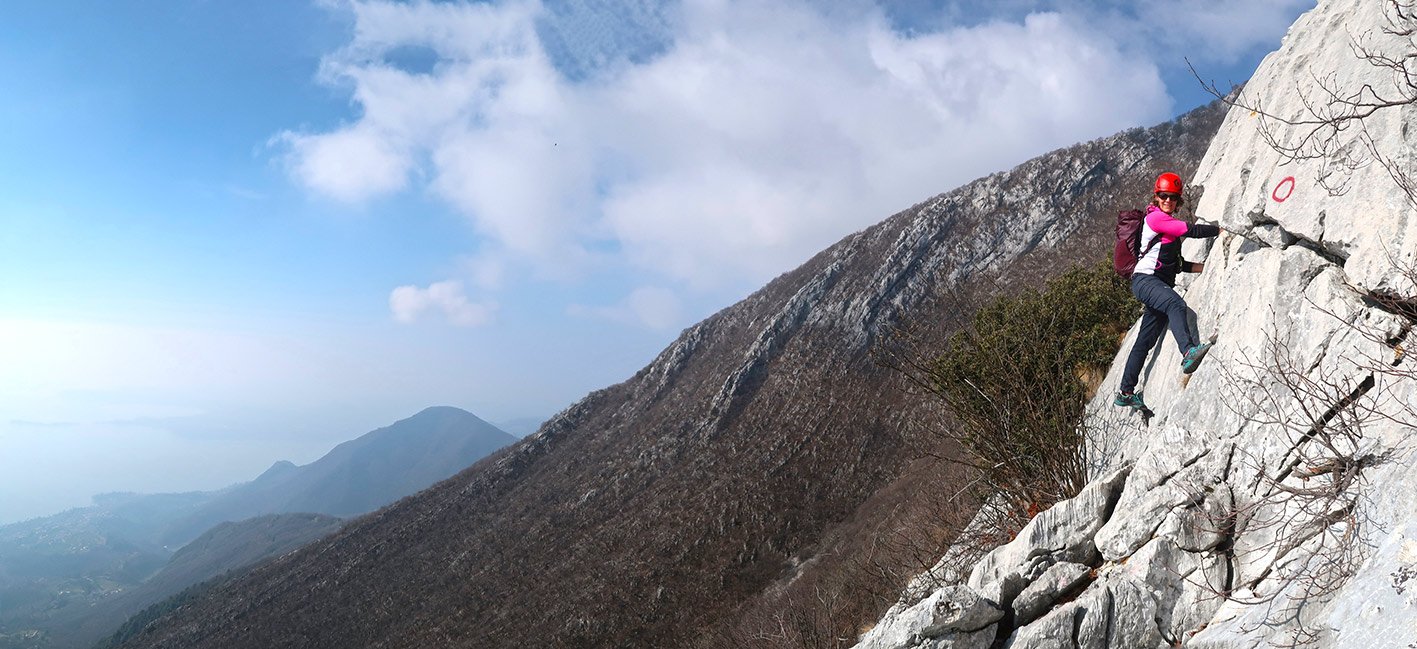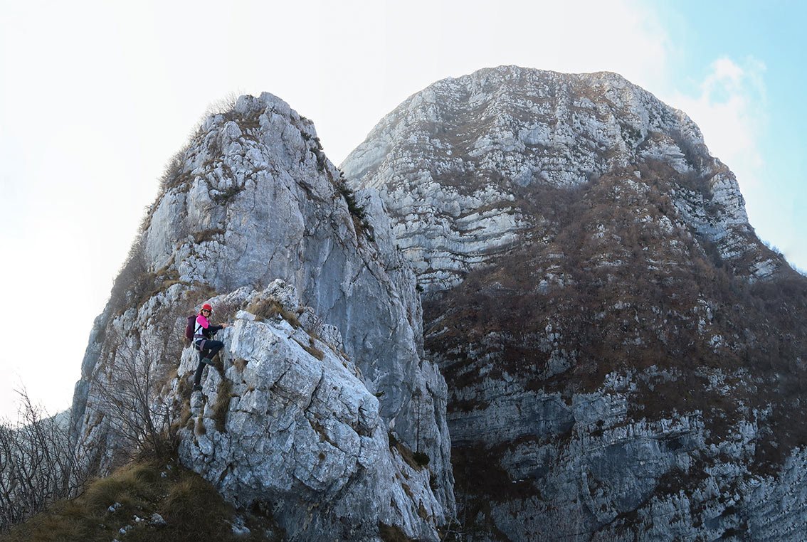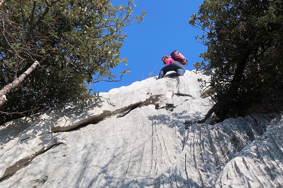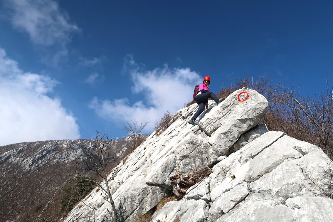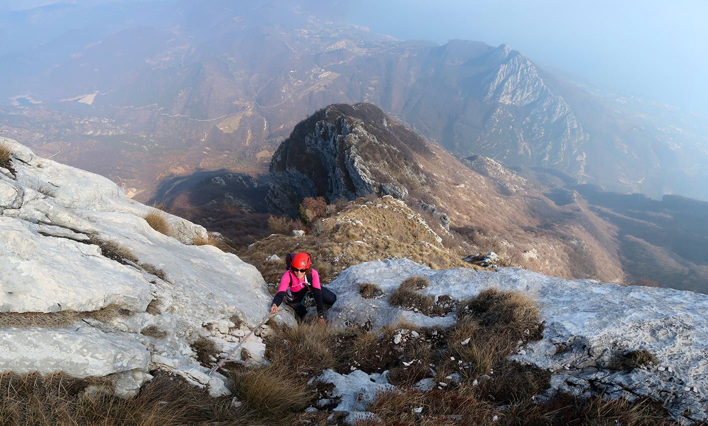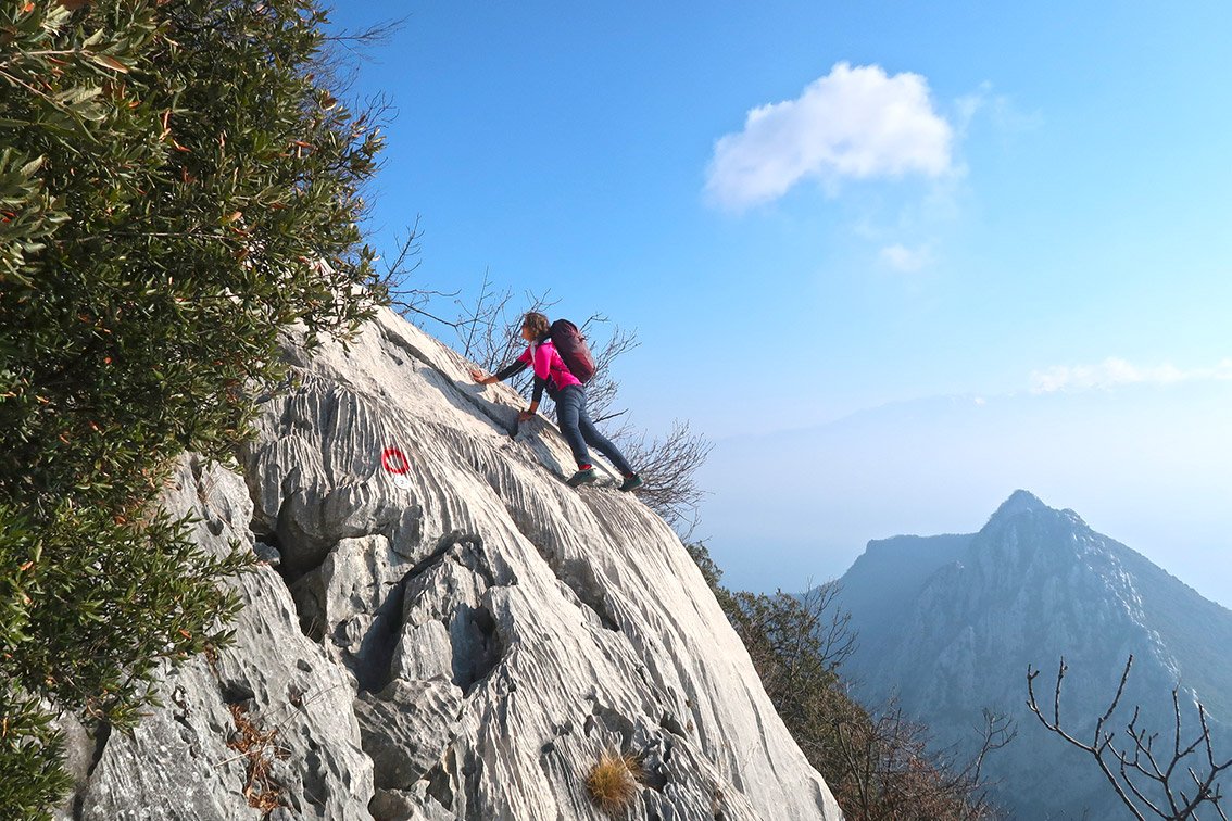 Der Cresta Sud-Est zum Gipfel des Pizzocolo ist ein toller, leichter Klettergrat mit perfektem, vom Wasser zerfressenem Fels! Wer es im oberen Teil noch etwas anspruchsvoller haben will, kann nach rechts zum Sentiero alpinistico Tre Amici Finale queren. Der Anstieg ist ein schöner Mix aus Wanderung und Kraxelgrat, wobei der Fels im unteren Teil des Cresta Sud-Est mega griffig ist und deshalb das seilfreie Klettern wirklich großen Spaß macht. Egal für welchen Anstieg man sich entscheidet, man hat ein perfektes Kraxelerlebnis hoch oberhalb des Gardasees.