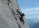 Neben der Route Happy End zieht die Route Da Capo fast eine Spur elleganter durch den Plattenpanzer hinter der Wemeteigenalm. Nach zwei Längen zum Einklettern wird die Sache oben etwas steiler, es tauchen aber meist unverhoffte Griffe auf! Die Route gehört sicher zu den besten Linien der Steinplatte. Großes Lob an Adi Stocker und seinen Gefährten !