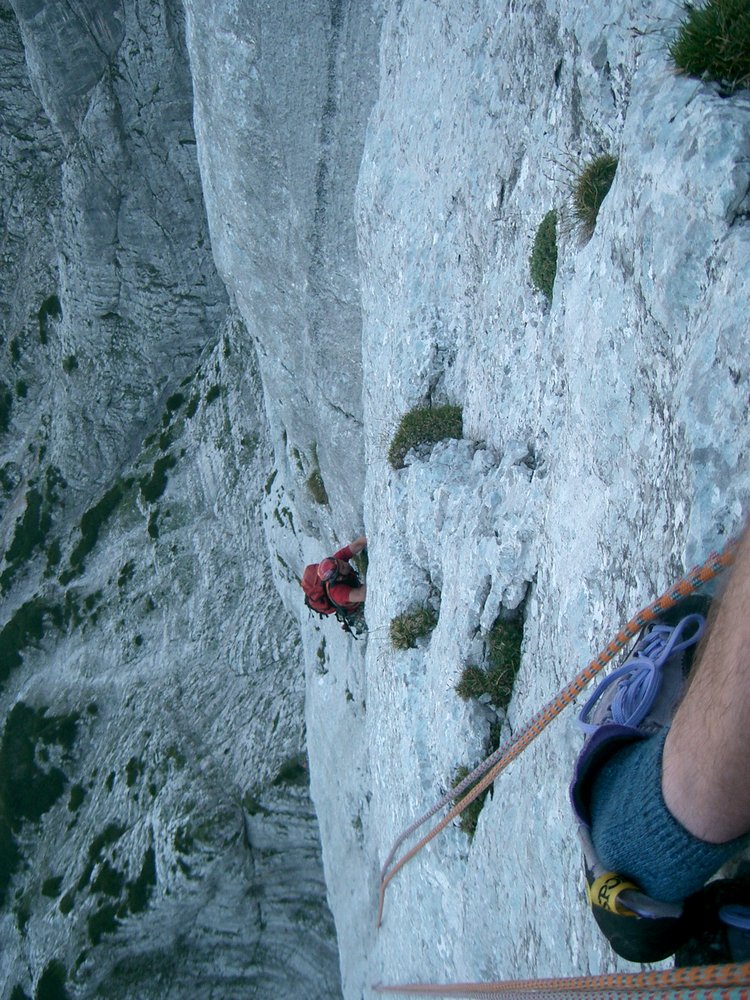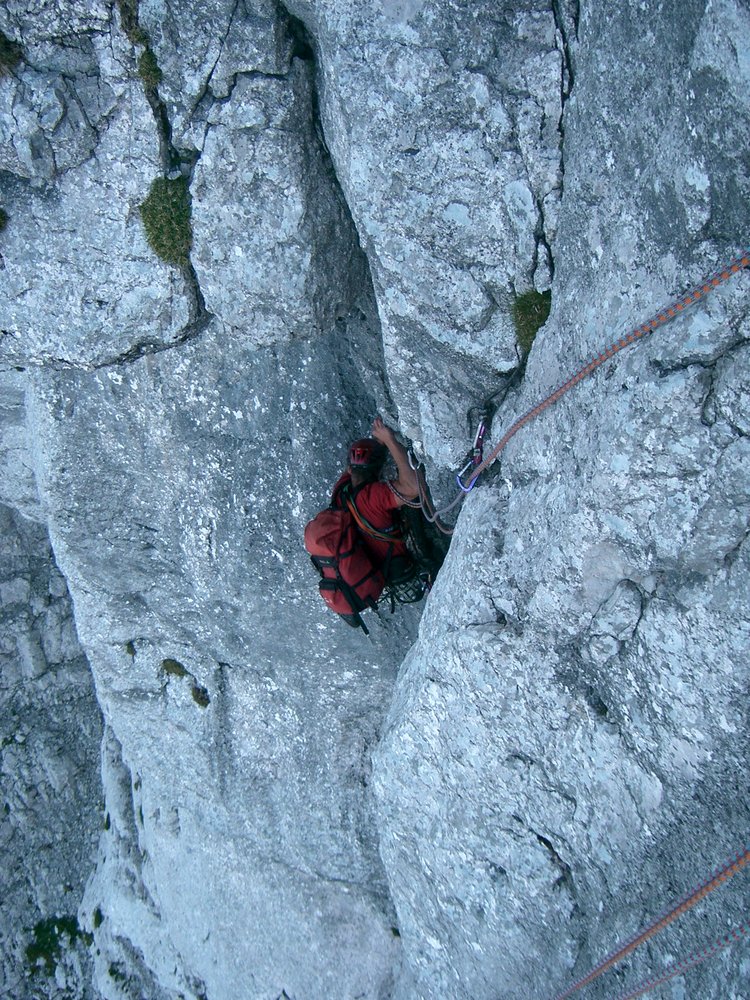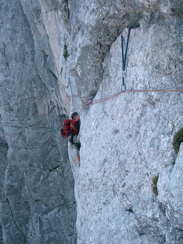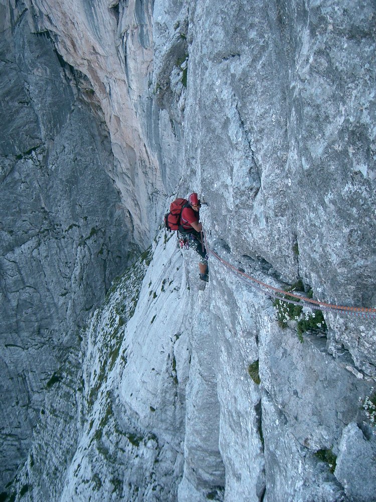 Ueber den flachen Plattenschuss am Dachlgrat in Richtung Rosskuppe. Ueber zwei Wandstufen auf den Gipfel der Rosskuppe (2152m) und Richtung Sueden auf dem Gratkamm abwaerts. Auf einem Band nach links in die Peternscharte. Weiterer Abstieg ueber den "Peternpfad" zum Materialdepot.