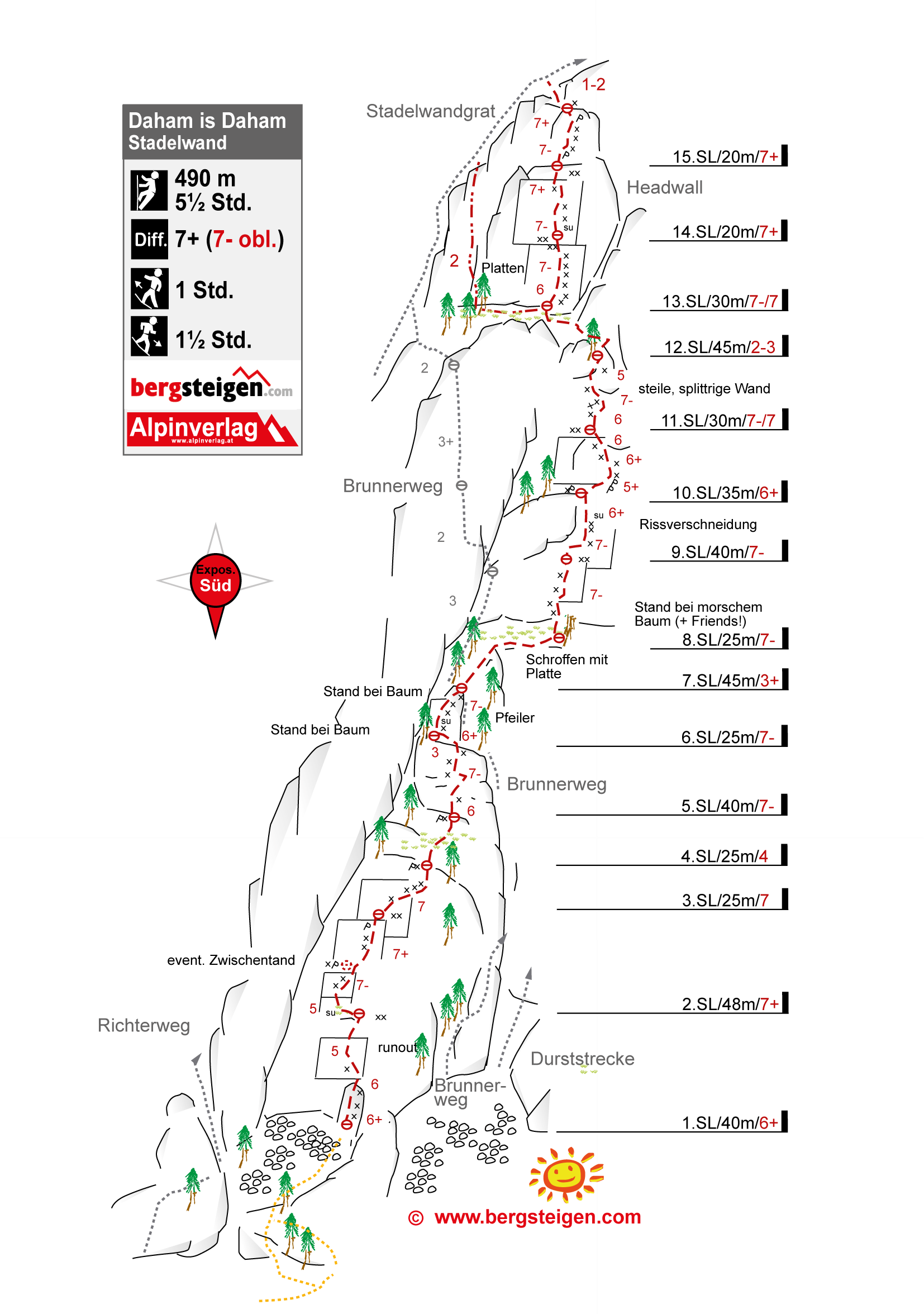 Mit Daham is Daham hat Thomas Behm wohl die sicherlich eine der schönsten Touren im 7ten Grad im Rax/Schneeberggebiet geschaffen. Einfach ein Hit für die Rax, der sich mit vielen Alpentouren messen kann. Eine exzellente Plattenkletterei, die nur durch wenige Unterbrechungen gestört wird. Die Absicherung ist gut, der 7te Grad sollte aber dennoch beherrscht werden. Rückzug prinzipiell jederzeit möglich. Im Sommer durch südseitige Ausrichtung rasch zu heiß. Im Winter durchaus möglich, jedoch sollte man die 16 SL nicht unterschaetzen (Tageszeit!). Viel Spaß!