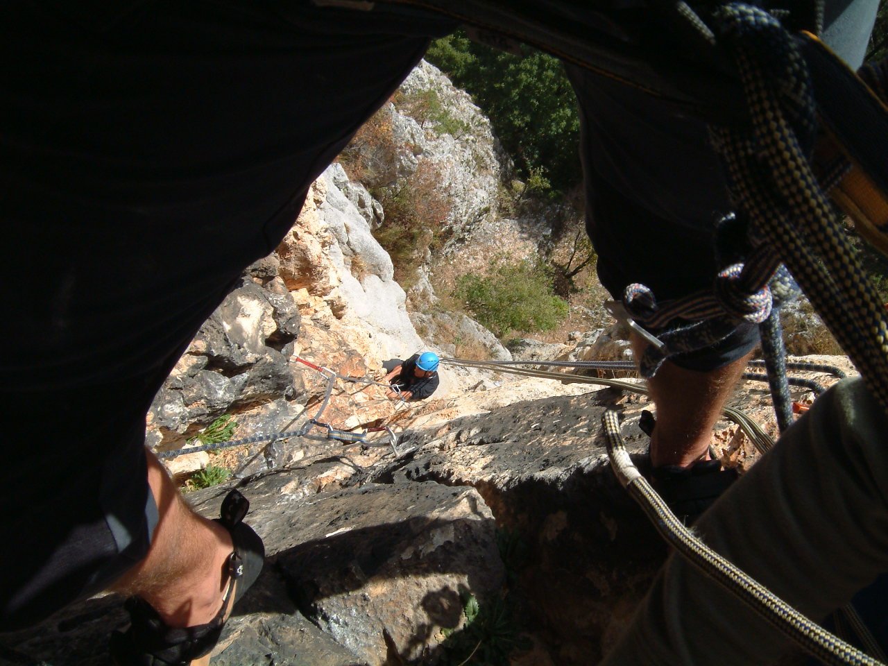Die Route ist mit Klebehaken (Eigenbau Stahlblechlaschen) gesichert. Standplätze sind geklebte Ringhaken. Einige Normalhaken sind noch in der Tour, aber nicht notwendig.