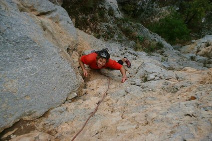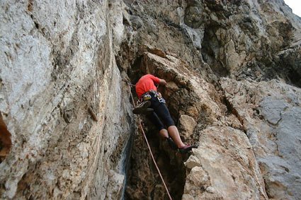 Sehr schöne und vor allem steile Route durch die dunkelbraunen Kamine links vom Hochfallpfeiler. Die Tour ist saniert, hat jetzt nur noch 2 , dafür sehr lange, Seillängen und ist ein wahrer Klettergenuss mit perfekter Absicherung. Oft sehr steiler guter Fels mit vielen Henkeln. Leider ist er an der schwersten Stelle schon ziemlich abgeschmiert, sonst aber einfach ein Muss. Der ausgesetzte Kamin sucht seines Gleichen im Wiener Raum. Keine Sorge, es muss nicht gestemmt werden, man spreizt elegant aus. Man kann auch 3 SL machen, dann hat die 2. nur ca. 10 m. Sicher die absolute Toptour im Grad 6+ auf der Hohen Wand.