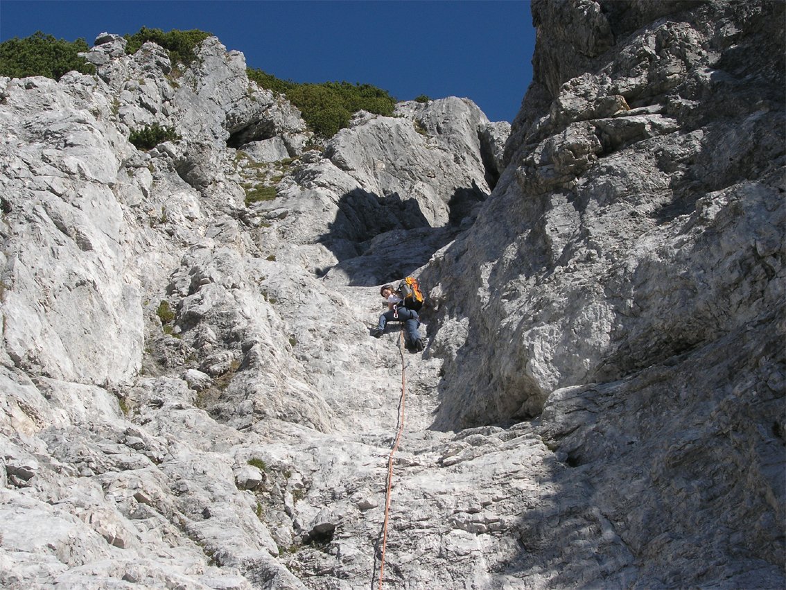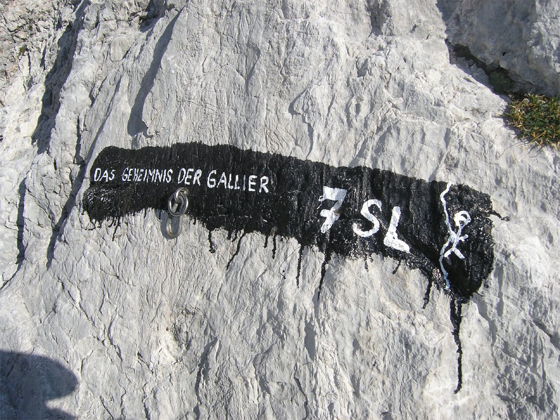 Mit dieser Tour wurde eine leichte, für Kinder und Einsteiger gleichermaßen geeignete Route eingerichtet. Obwohl die Tour weit unter dem Gipfel endet, ist die Kletterei frei von rutschiger Botanik. Dank des festen und griffi gen Gesteins ist die Schlüsselseillänge, im Schwierigkeitsgrad 3+, auch ohne den berühmten gallischen Zaubertrank zu meistern. Die Orientierung in der Route fällt auch einfach aus, denn der Routenverlauf folgt immer der großen Rinne bis zum Ausstieg, wo man, nach erfolgreichem Beenden der Tour, auf der schönen Wiese gemütlich Brotzeit machen und die Aussicht genießen kann. In Verbindung mit dem Klettergarten im Einstiegsbereich, lohnt sich ein Besuch noch mehr.
