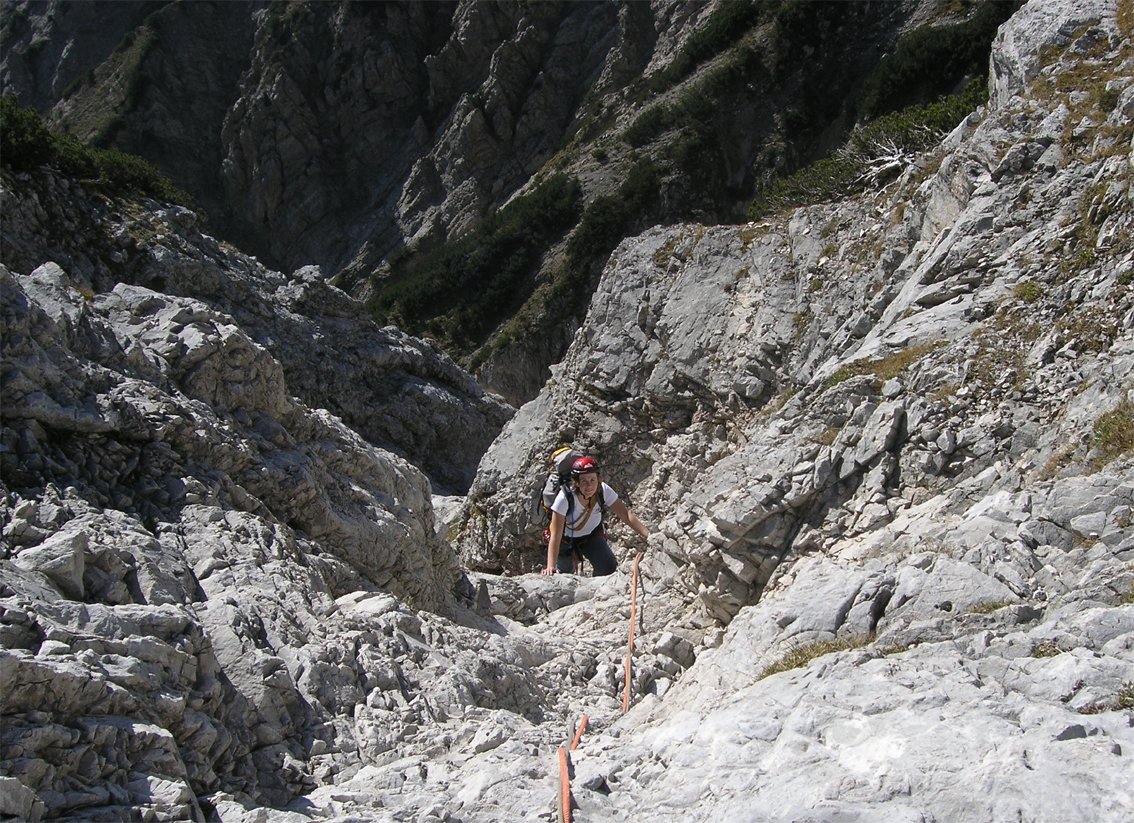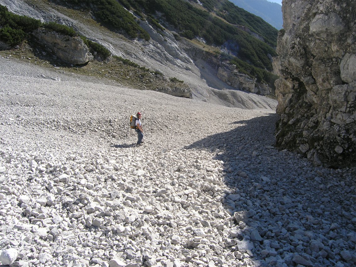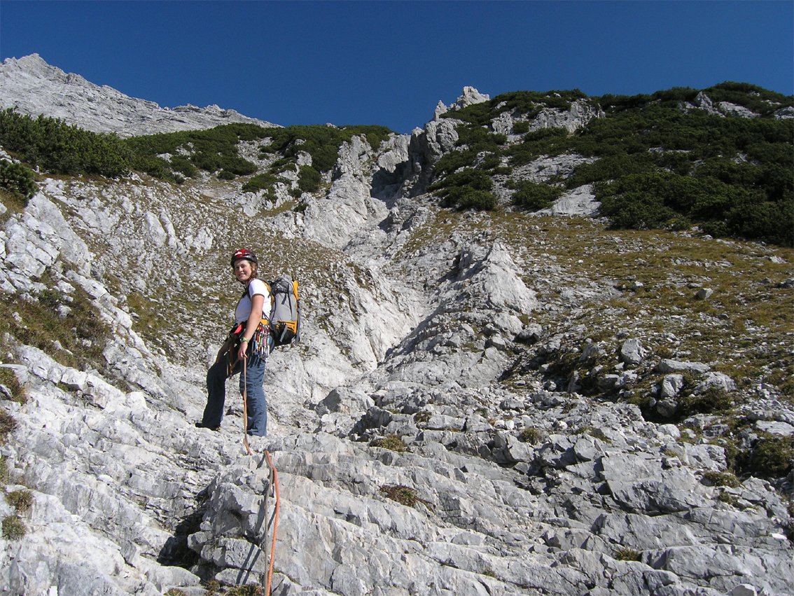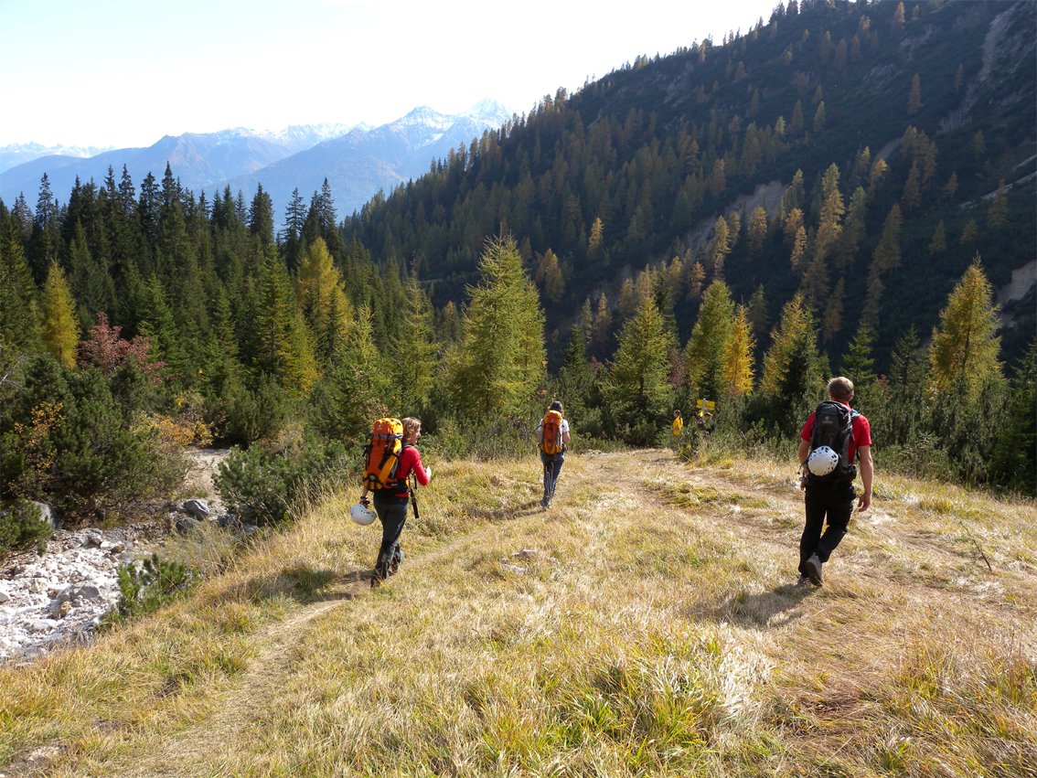 Vom Ende der Schwierigkeiten steigt man noch etwas die Rinne hinauf und quert dann je nach Möglichkeit nach links über die Wiesen zum Karkopf Normalweg. Über diesen steigt man dann wieder zur Alplhütte ab.