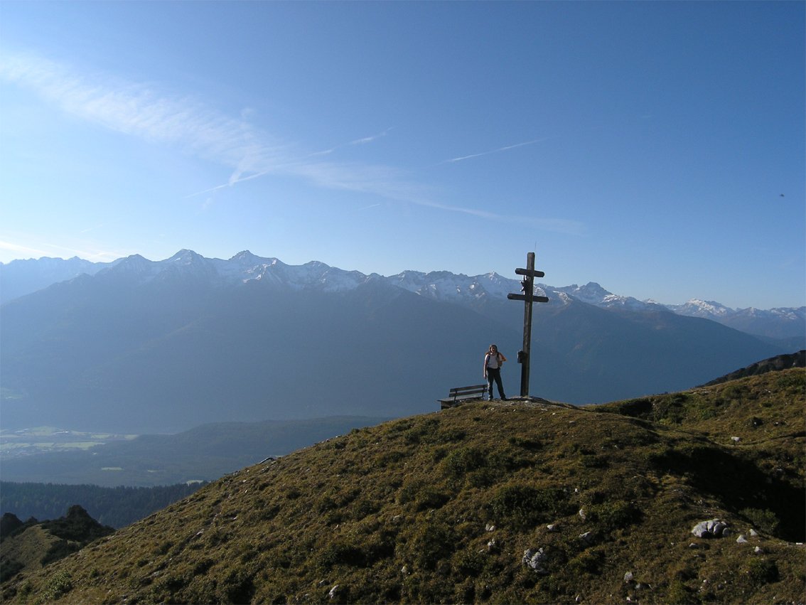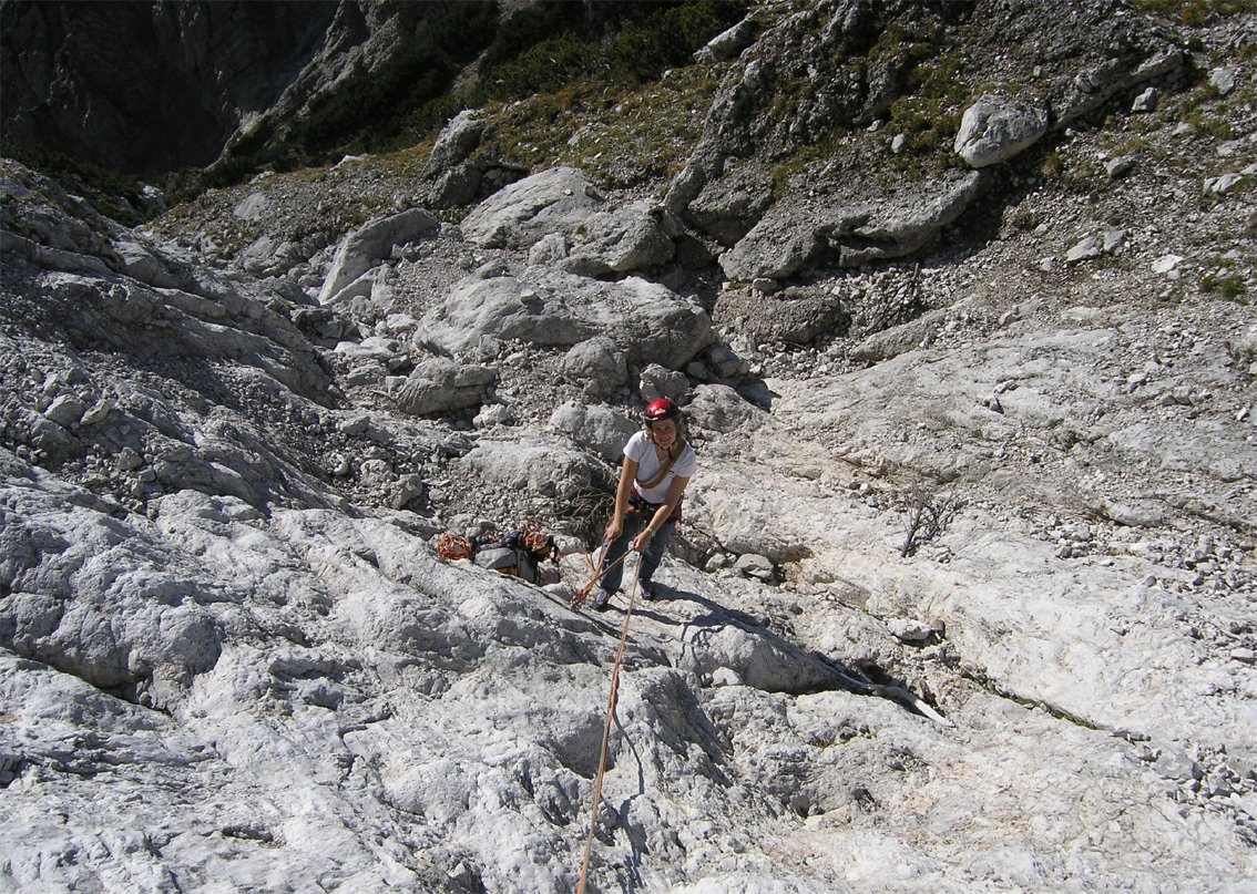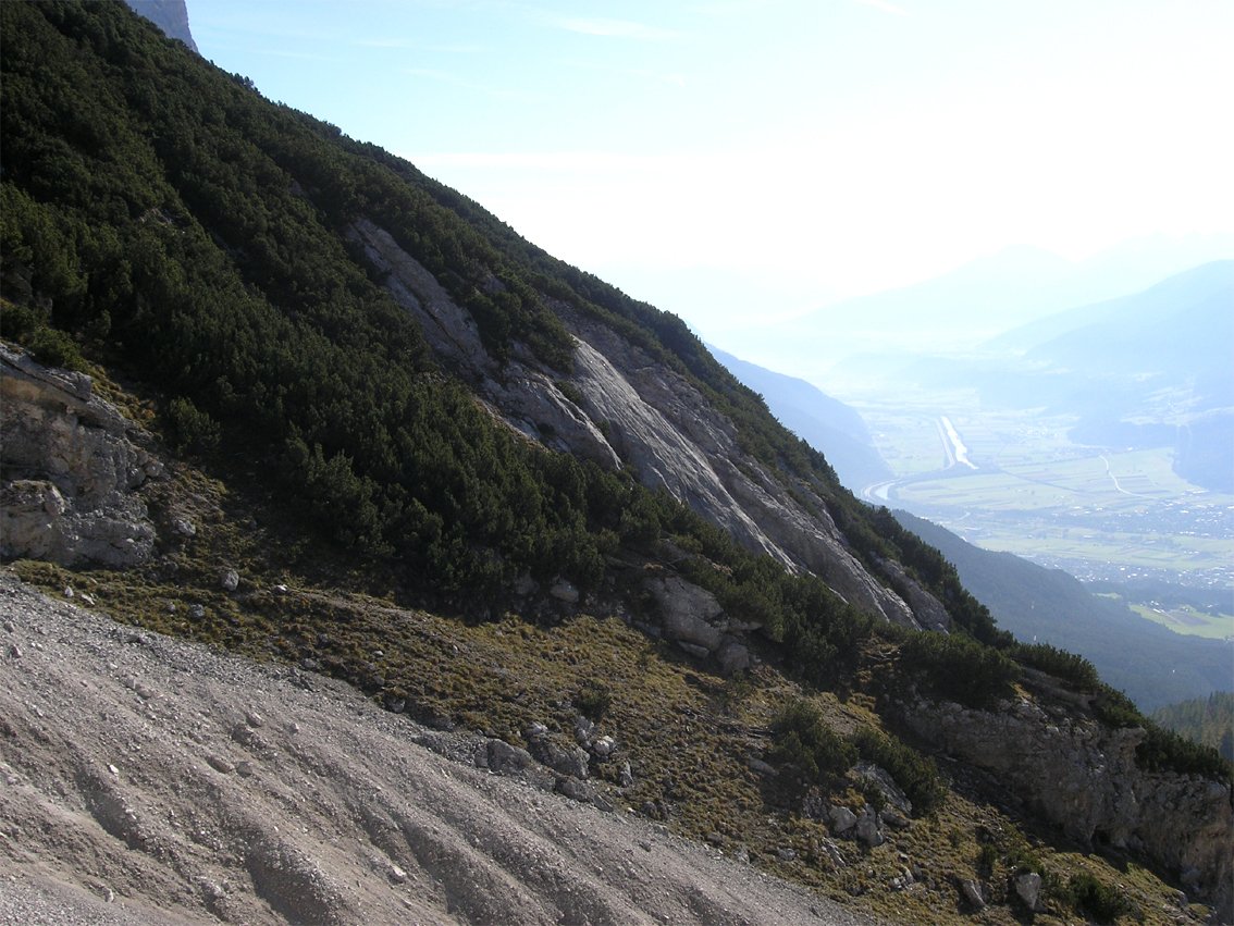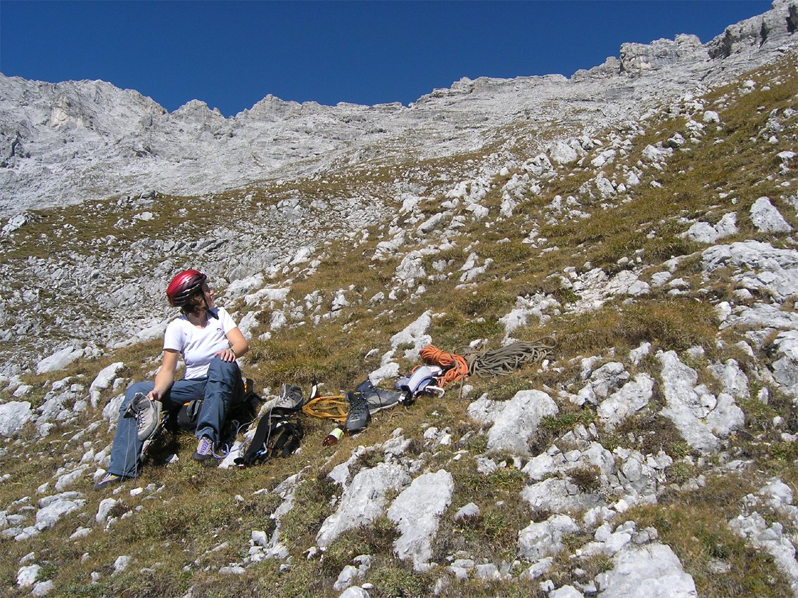Vom Ende der Schwierigkeiten steigt man noch etwas die Rinne hinauf und quert dann je nach Möglichkeit nach links über die Wiesen zum Karkopf Normalweg. Über diesen steigt man dann wieder zur Alplhütte ab.