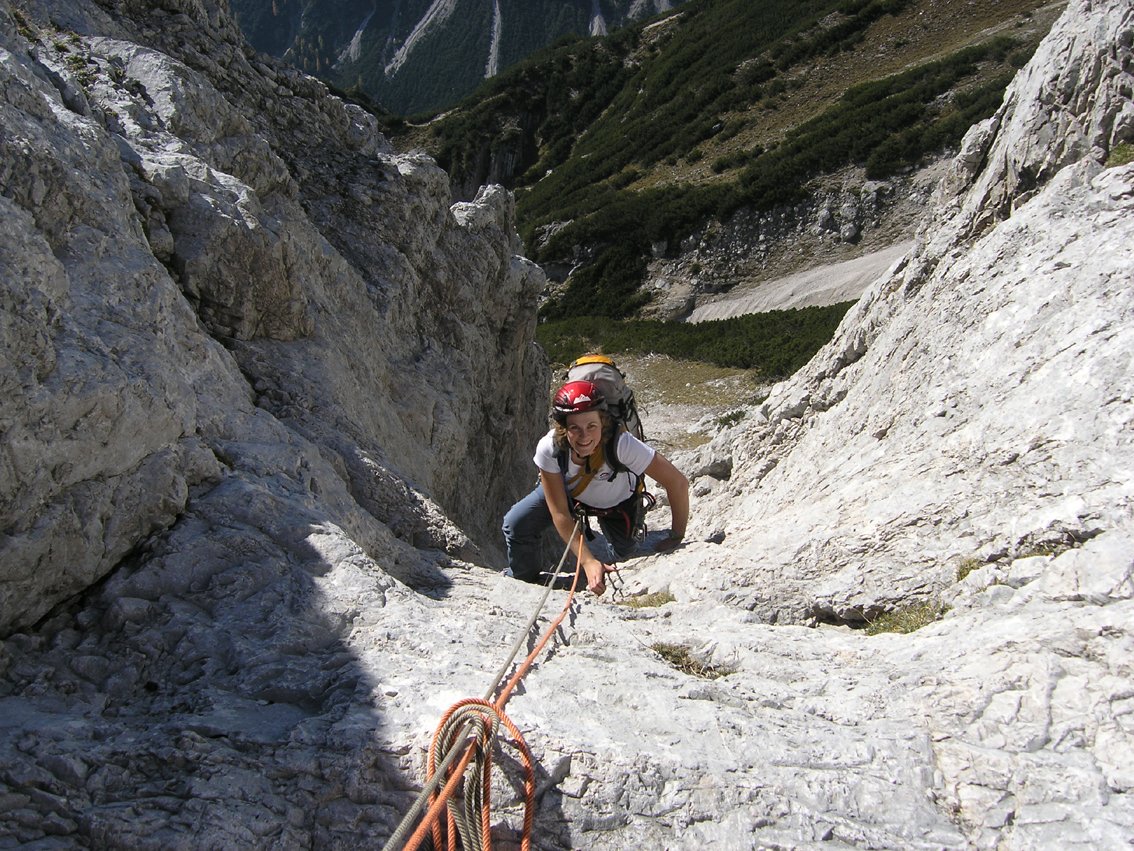 Die Tour ist sehr gut mit Bohrhaken versichert, leider fehlen aber schon ein paar Laschen an den Bohrhaken, vermutlich durch Steinschlag. Die Absicherung ist aber trotzdem ausreichend. Im Frühjahr ist die Route nicht zu empfehlen, da oft noch Schnee vorhanden sein kann. In der Klettersaison ist im Besonderen auf Steinschlag zu achten, da man in der Rinne den von oben kommenden Steinen nicht ausweichen kann.