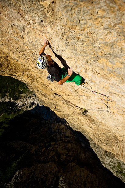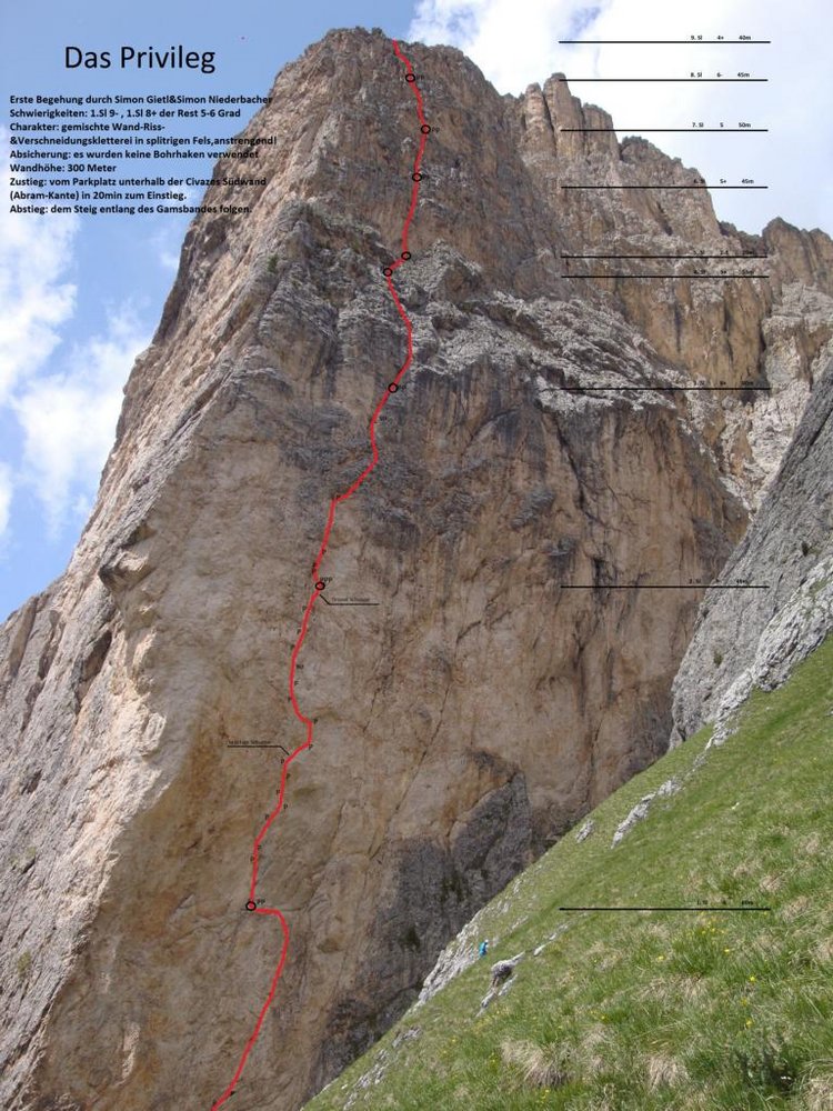 Gemische Wand-, Riss- und Verschneidungskletterei im splittirgen Fels, anstrengend. Die Geschichte der Erstbegehung findet ihr hier