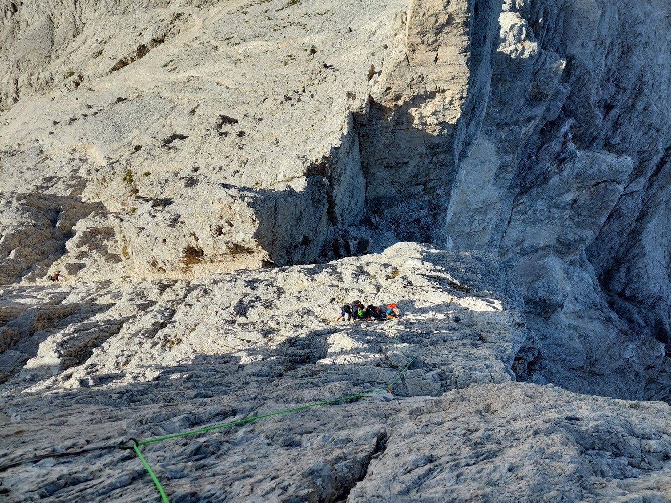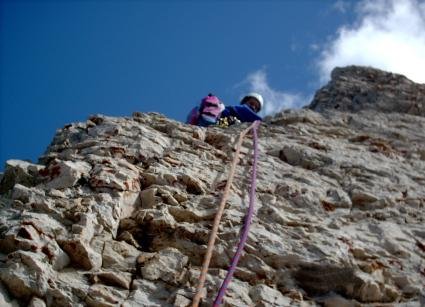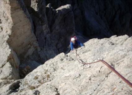 Von der Gartlhütte zur Südwand des Delagoturms ansteigen und an die Kante. Dort erster Standplatz.