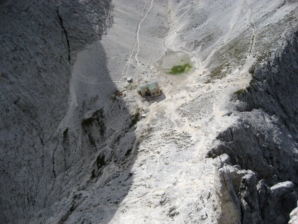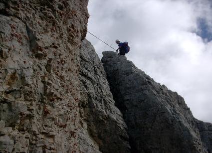 Abseilpiste durch die Schlucht zwischen Delago- und Stabelerturm; zementierte Abseilringe.