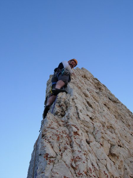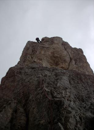 Das Herzstück der Tour ist die zweite Seillänge in der man immer genau an der Kante bleibt, manchmal sogar extrem ausgesetzt mit einem Fuß an der NW-Seite, mit dem anderen an der SO-Seite.