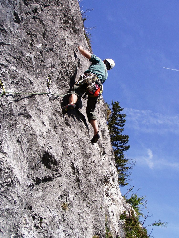 „Der Flotte Dreier“ ist neben der „Bronchitis“ eine der beliebtesten Sockeltouren an der Martinswand. Die Tour wird nach oben hin immer besser. Die Schlüsselstelle ist eine schöne Querung, welche gleich zu Beginn schwer ist. Danach kommt noch eine 5er-Plattenstelle, diese klettert man am besten rechts. Beim ersten Standplatz kreuzt von rechts die Route „Emmentaler“ - von dort steigt man gerade die Verschneidung weiter hinauf.