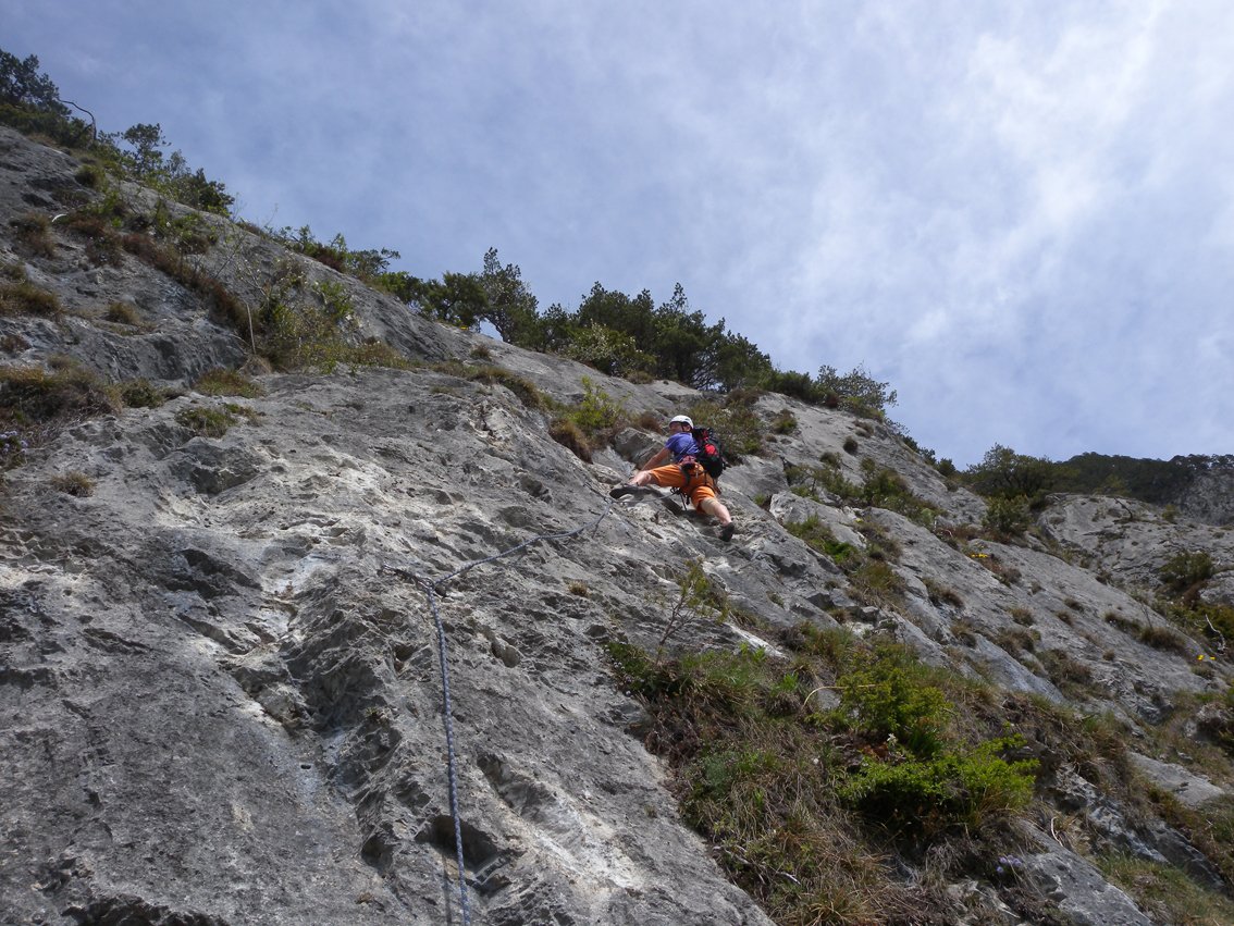 Wie bei den anderen Martinswandrouten unbedingt einen Helm auf setzen, im Idealfall schon beim Zustieg unterhalb der Wand - oben ist viel Schutt (sind auch Gämsen, die Steine lostreten können). Bei starkem Föhn können sich die Steine (durch die Bewegung der Latschen) von alleine lösen.